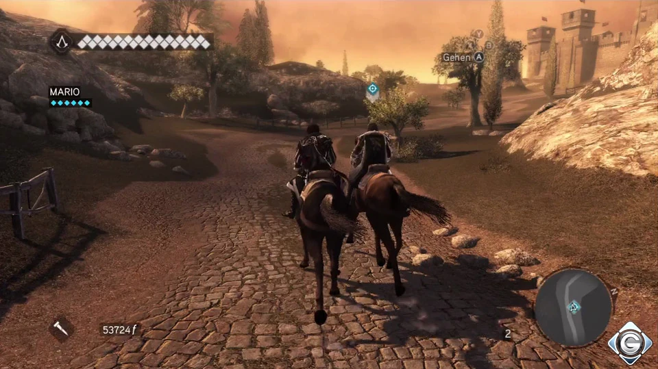(Im Januar 1500 kehren Ezio und Mario nach Monteriggioni zurück und reiten auf Pferden nebeneinander zur Stadt.)