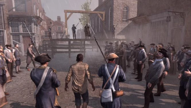 Connor wird am nächste Morgen zum Galgen geführt und die Menge beschimpft ihn. Hickey erscheint und erzählt ihm, dass es für ihn keine Verhandlung geben wird und selbst Washington unter den Zuschauern ist. Eine wütende Frau schlägt auf Connor ein, als plötzlich Achilles vorbeikam und ihm sagte, er müsste nur ein Zeichen geben und die Assassinen würden helfen. Nachdem Lee die Anklagepunkte vortrug, stülpte er Connor einen Sack über, legte die Schlinge um den Hals und betätigte den Hebel. Das Seil wurde von einem Wurfmesser zerschnitten, welches von Haytham Kenway geworfen wurde. [2] Connor stürmt los und rettet Washington, indem er Hickey tötet. Connor erfuhr lediglich nur noch von Hickey, dass er nur mitmachte, da die Bezahlung gut war. Nach Hickeys Tod wird Connor von Wachen umstellt, die jedoch auf den Befehl Putnams ablassen. Washington ist bereits nach Philadelphia aufgebrochen, Connor folgt ihm da er noch immer in Gefahr ist. Connor wird von Achilles abgehalten, Washington einzuweihen, da nur das ihn schützt. Nachdem die Unabhängigkeitserklärung von Leuten wie Hancock, Franklin und Adams unterschrieben wurde, bricht Washington nach New York auf, um es vor britischen Angreifern zu verteidigen. [1]