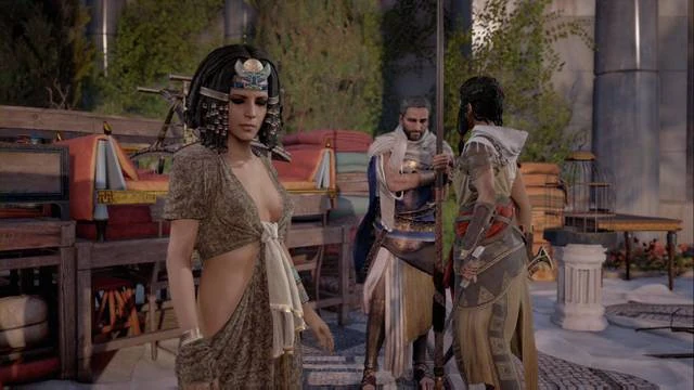 En el 47 a.e.c, Apolodoro, Aya, Bayek y Cleopatra abordaron el trirreme de Fóxidas y zarparon hacia Alejandría. A pesar de enfrentarse a numerosos barcos ptolemaicos, pudieron llegar al puerto del palacio real, que había sido fuertemente custodiado por soldados de Ptolomeo y de César. Como Cleopatra sería reconocida de inmediato, se envolvió en una alfombra y fue llevada por Apolodoro, quien se hizo pasar por un Phylakitai de Heliópolis, mientras que Aya y Bayek se hicieron pasar por sirvientes. El grupo llevó canastas de ofrendas y fueron escoltados al palacio por un legionario romano, donde se encontraron con el encuentro de Ptolomeo XIII con César.