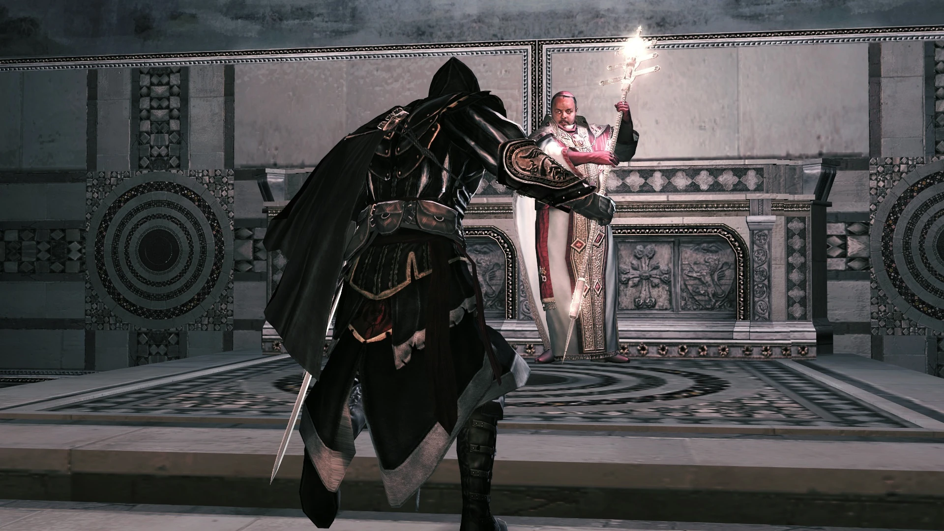Rodrigo Borgia confrontando a Ezio Auditore.