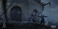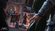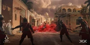 Après un visuel de la mission supplémentaire Les quarante voleurs ayant fuité sur l'Ubisoft Store, les comptes officiels Assassin's Creed sur les réseaux sociaux ont publié officiellement la première image de promotion d'Assassin's Creed: Mirage, le 01 septembre 2022. On y voit ainsi Basim effectuer un assassinat aérien devant le palais de la Porte d'or de Bagdad.[15] Le jeu fut plus tard révélé avec un premier trailer lors de l’Assassin's Creed Showcase, événement dédié aux 15 ans de la franchise.