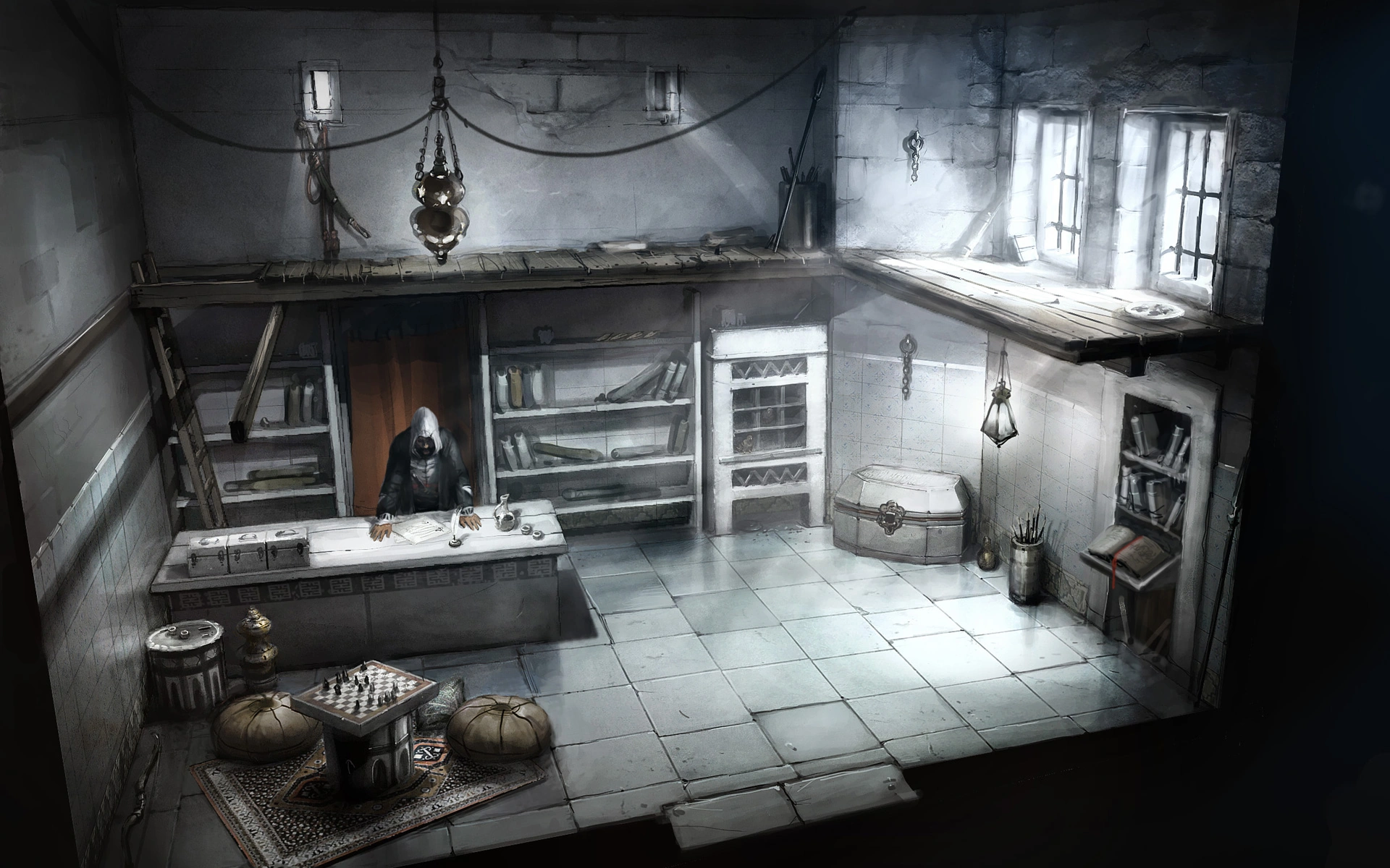 Au Moyen-Âge, les bureaux faisaient office de sanctuaires pour les membres de la Confrérie, dans lesquels les Assassins pouvaient se préparer physiquement et mentalement pour une mission par la méditation ou le simple repos, ainsi que pour se réapprovisionner en armes, notamment en couteaux de lancer. Ces bâtiments permettaient aux Assassins d'attendre patiemment le bon moment pour traquer leur cible, puis de s'y dissimuler une fois l'acte commis et les gardes à leur recherche.
