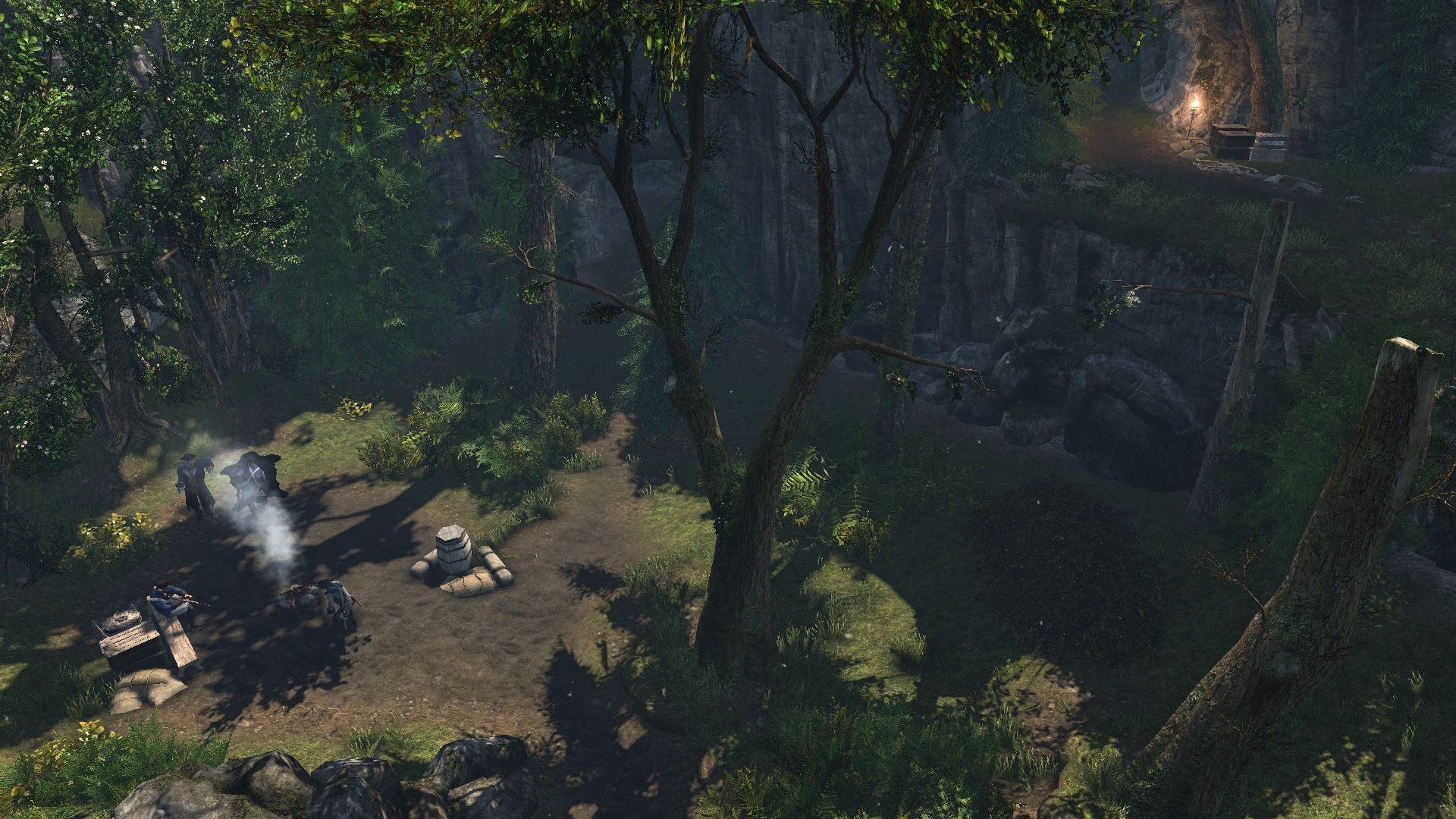 Cet endroit avait autrefois été la demeure des Iroquois, comme l'indique la présence et de peintures rupestres représentant la Femme du Ciel. Durant la guerre de Sept Ans, les Français y édifièrent un de leurs campements militaires. Le Templier Shay Cormac visita les lieux et y récupéra une relique cachée dans un pilier indigène.