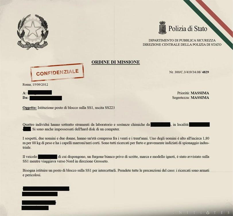 Le 15 septembre 2012, la police d'État à Rome reçut l'ordre confidentiel de dresser un barrage routier à Grosseto sur l'autoroute d'État 1, sur la sortie 223, avec pour objectif d'intercepter une équipe d'Assassins qui s'enfuyaient vers le nord après avoir quitté la capitale italienne. L'ordre qualifiait les deux hommes (Desmond Miles et Shaun Hastings) et les deux femmes (Lucy Stillman et Rebecca Crane) de dangereux fugitifs recherchés pour vol et espionnage industriel.