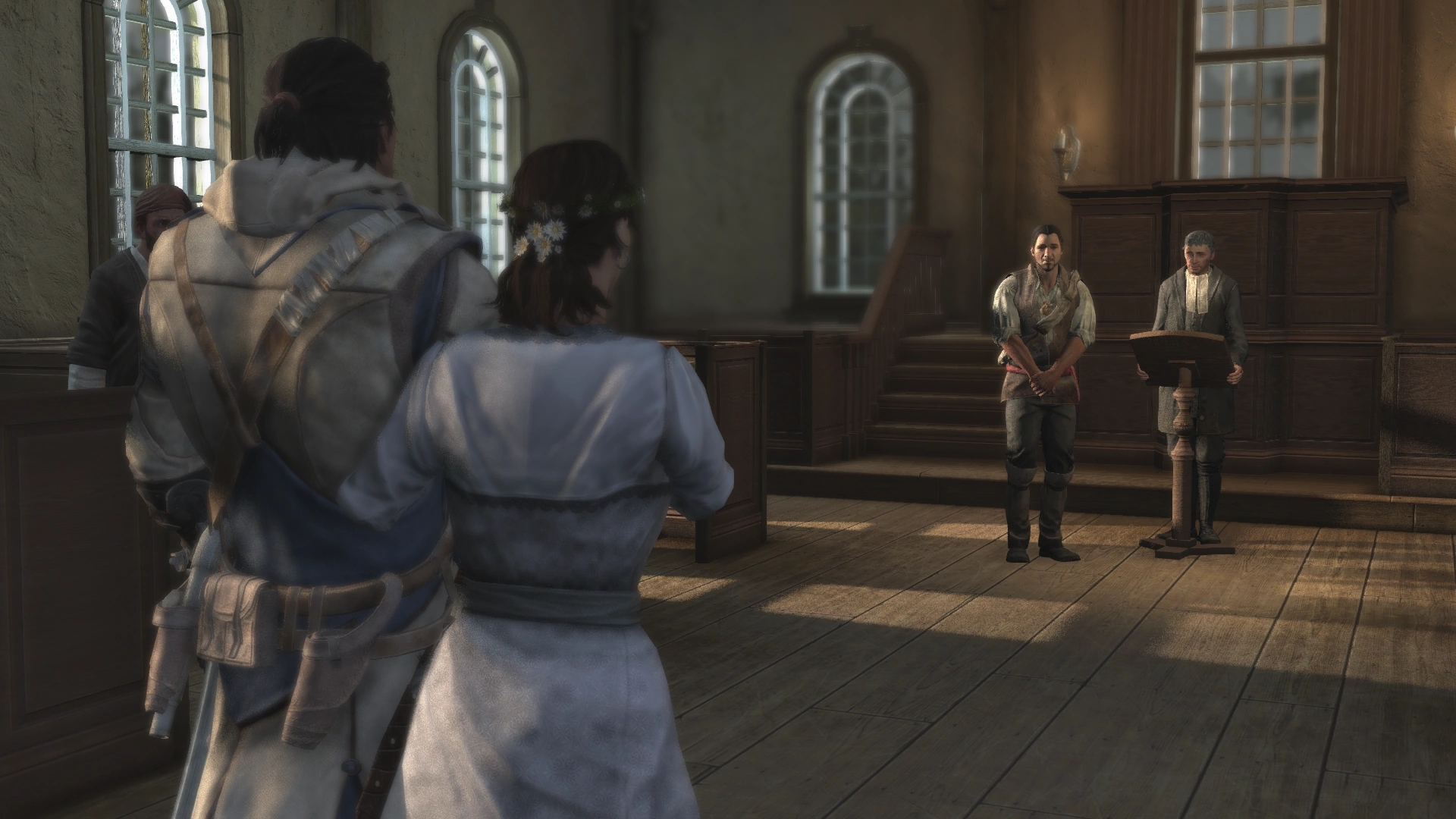 Le mariage est la représentation virtuelle d'une mémoire génétique de Connor Kenway, revécue en 2012 par Desmond Miles à travers l'Animus.