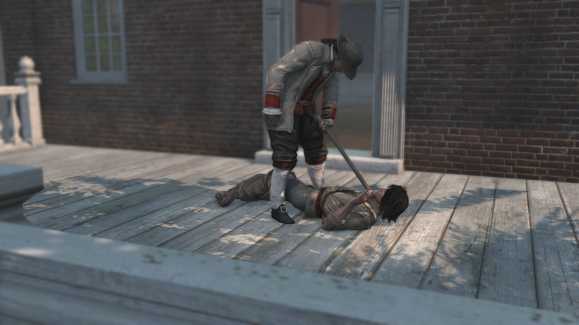 Achilles ouvrit la porte et mit Ratonhnhaké:ton à terre à l'aide de sa canne. Il tint fermement celle-ci sous la gorge de l'intrus.