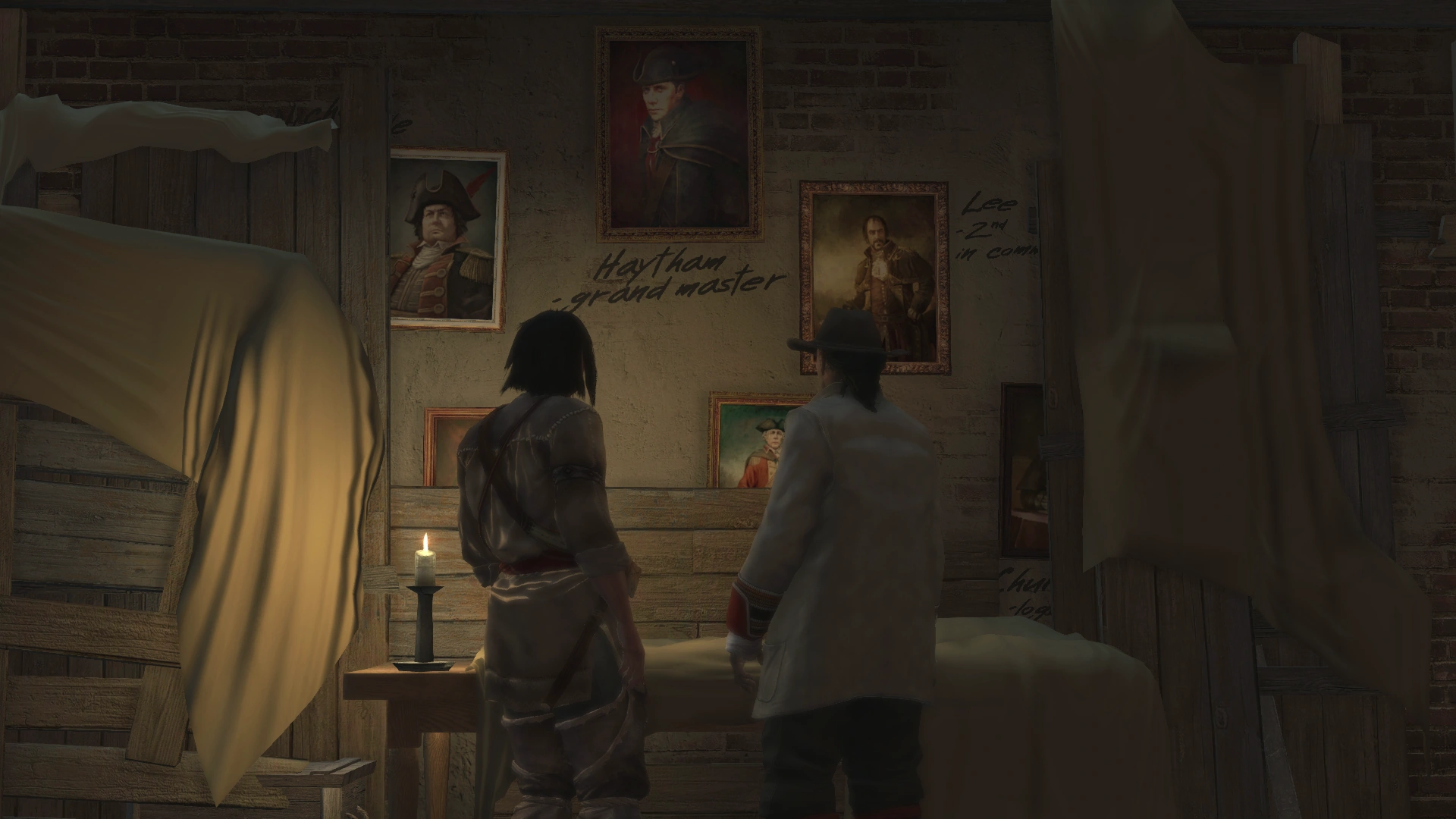 Ratonhnhaké:ton retira un panneau posé contre le mur, derrière laquelle étaient accrochés les portraits d'Haytham Kenway, Charles Lee, William Johnson, John Pitcairn, Nicholas Biddle, Thomas Hickey et Benjamin Church.