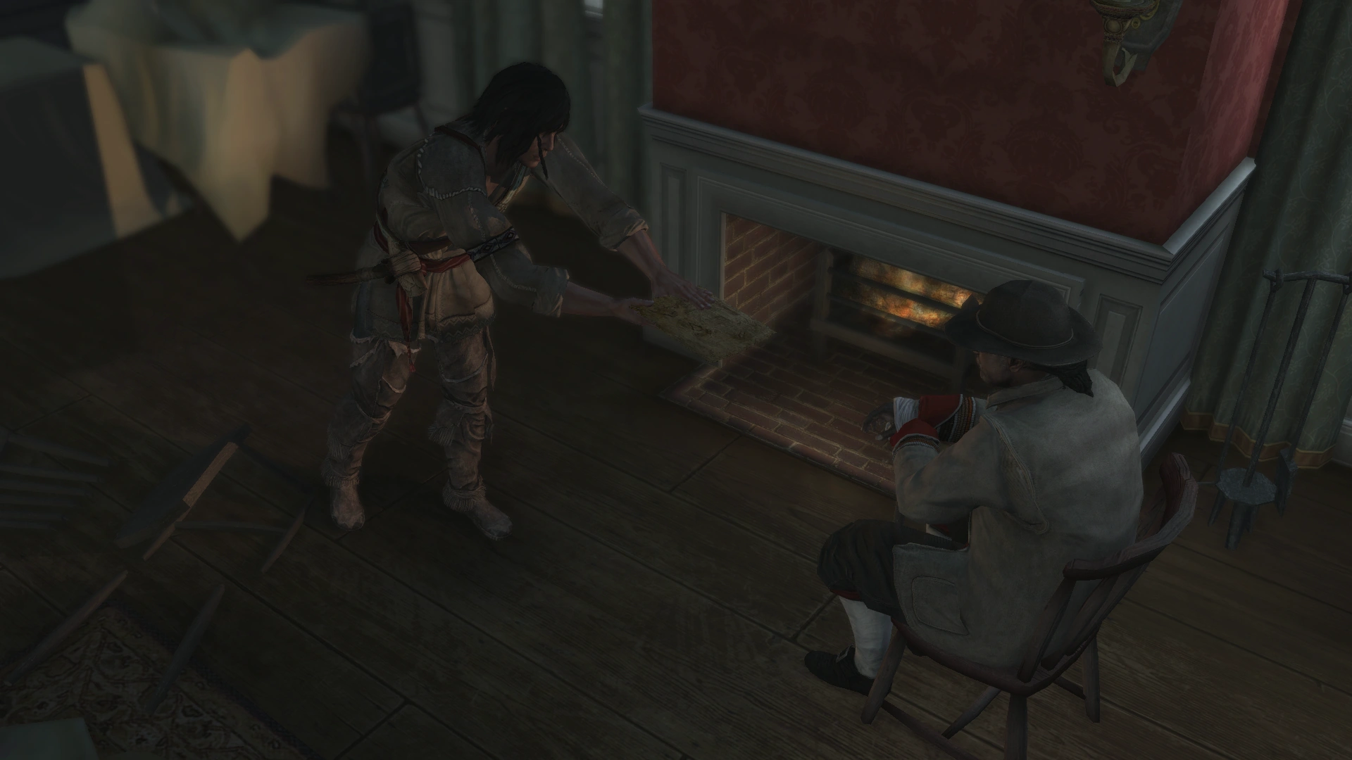 Achilles raccompagna Ratonhnhaké:ton à l'intérieur, puis ils entamèrent la conversation. En voulant s'asseoir, Ratonhnhaké:ton cassa une chaise.