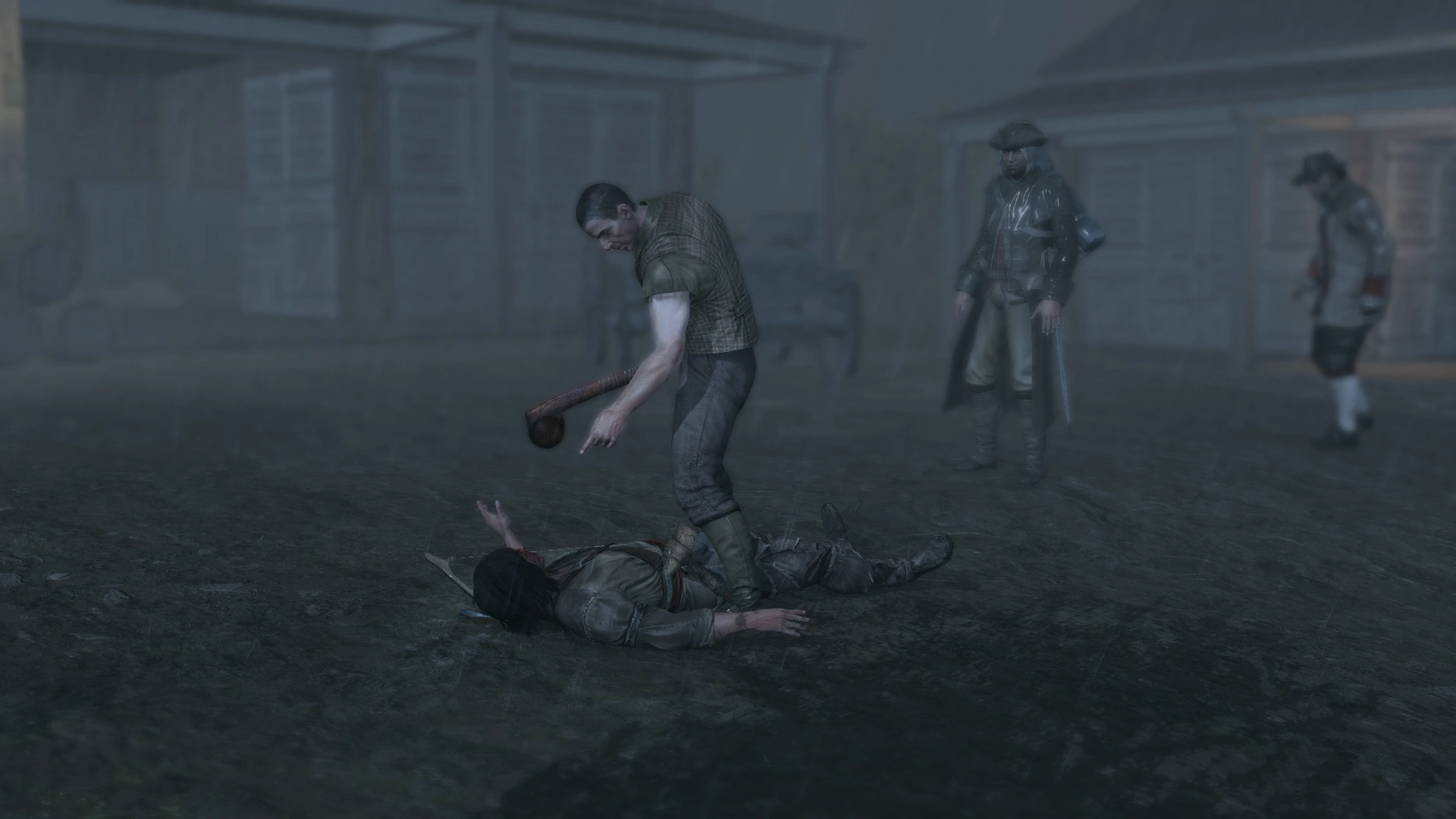 Voyant la nuit arriver, Ratonhnhaké:ton retourna aux écuries. Au milieu de la nuit, des cambrioleurs rôdèrent autour du manoir.