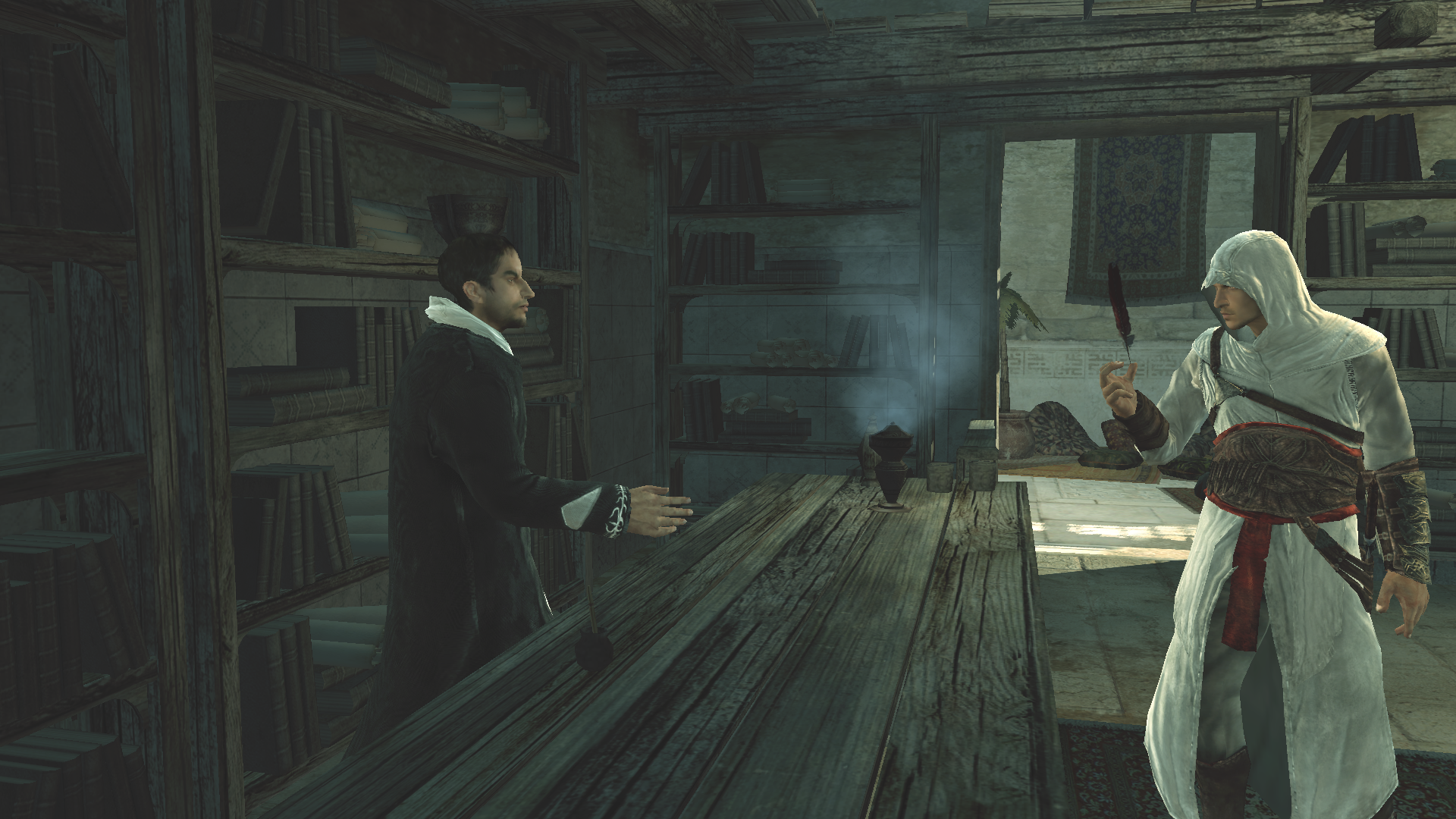 Altaïr mostra la piuma a Malik.
