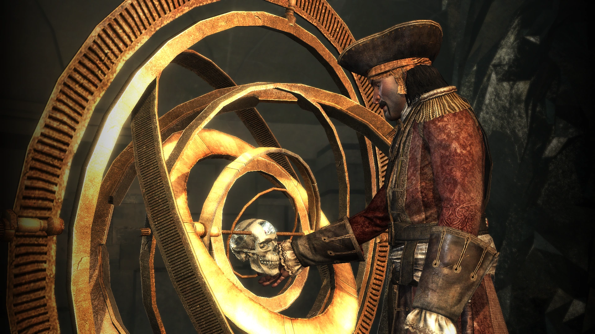 Subito dopo, il Saggio condusse il suo alleato alle porte del tempio, dove uccise tutti i membri della sua ciurma venuti con lui, sostenendo che la loro mente era troppo debole per resistere alla tentazione del potere che era custodito all'interno delle rovine. Così i due si avventurarono all'interno della struttura, di cui il Saggio iniziò a narrare la leggenda; infine giunsero alla platea principale. Sfruttando le fiale di sangue recuperate dai portoghesi, sfruttarono il Teschio di Cristallo incastonato nella sfera armillaria della sala per spiare le vite correnti di Jack Rackham e Woodes Rogers. Terminate entrambe le visioni, il Saggio prese possesso del manufatto e tradì Edward consegnandolo alle autorità di Port Royal.[9]