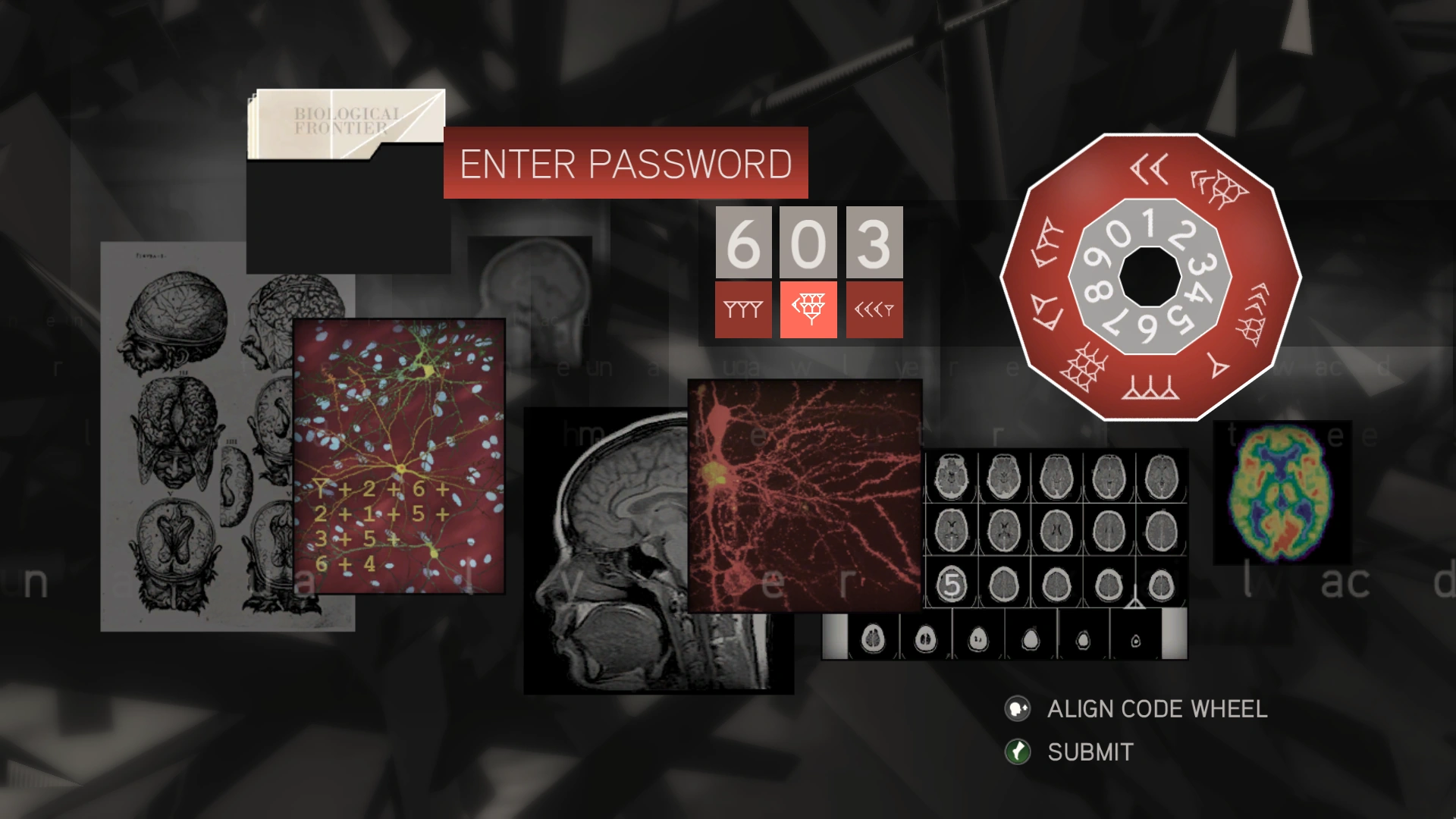 Mentre Desmond riviveva i ricordi del suo antenato, Shaun e Rebecca si resero conto che all'interno della simulazione ricreata dall'Animus erano presenti dei misteriosi simboli e chiesero al ragazzo di controllare cosa fossero e cosa significassero. Quando poi Desmond individuò il primo, gli Assassini si resero conto che i glifi, se osservati attraverso l'occhio dell'aquila di Ezio, permettevano l'accesso a dei file criptati accessibili solamente attraverso l'Animus. Desmond comprese così che le scritte fatte con il sangue che aveva visto sui muri del laboratorio erano indizi per suggerirgli di cercarli all'interno del macchinario.[2]