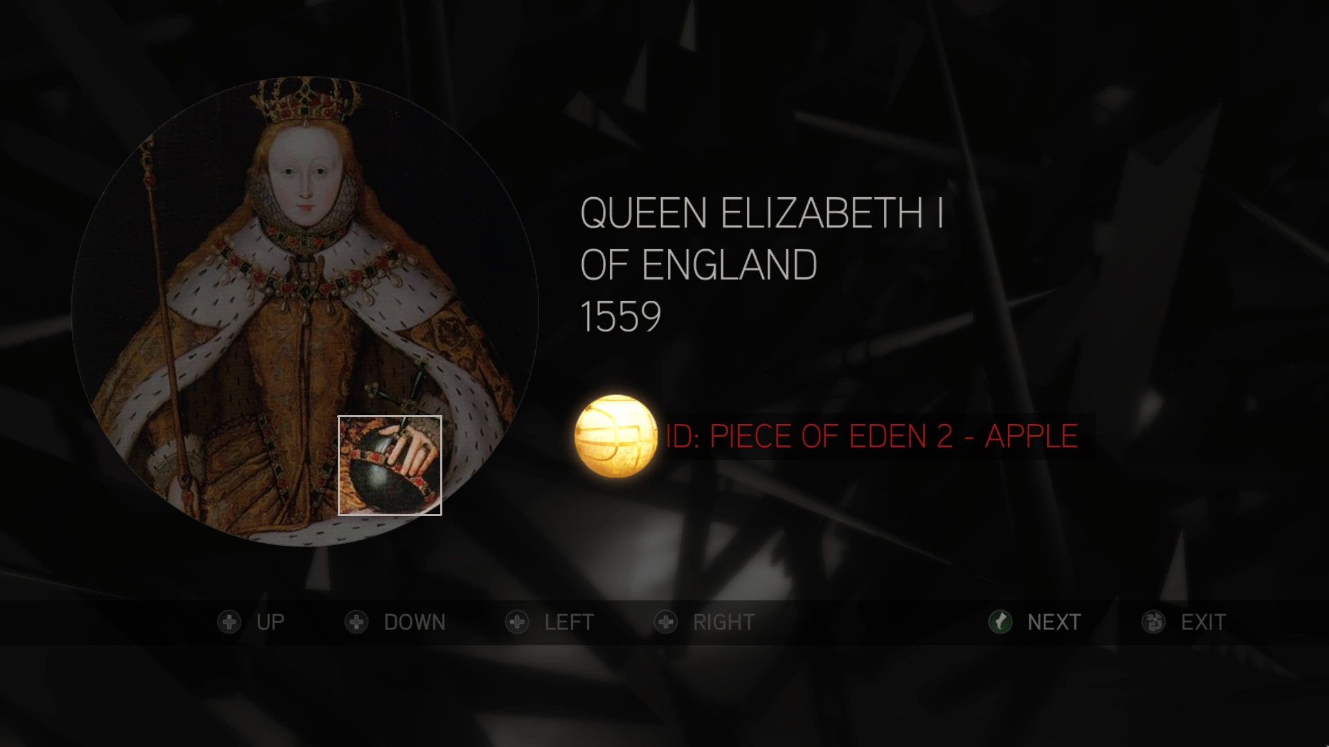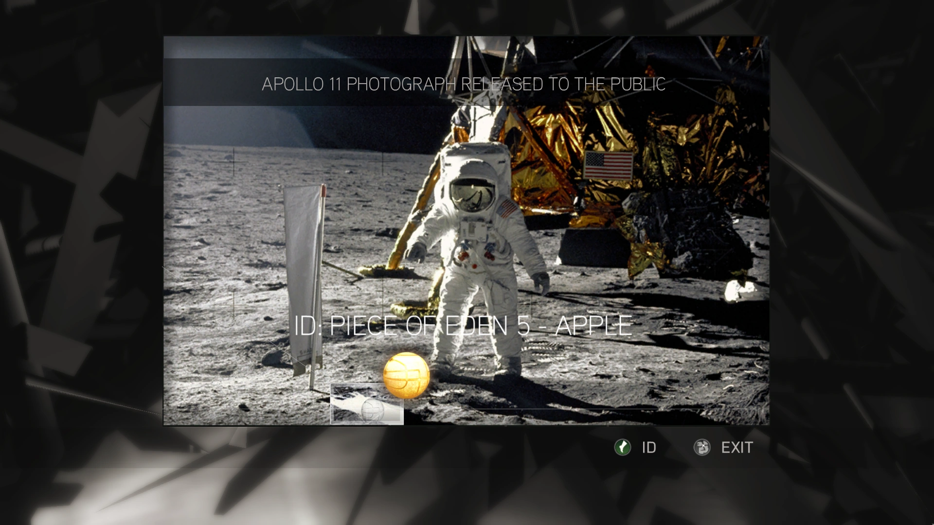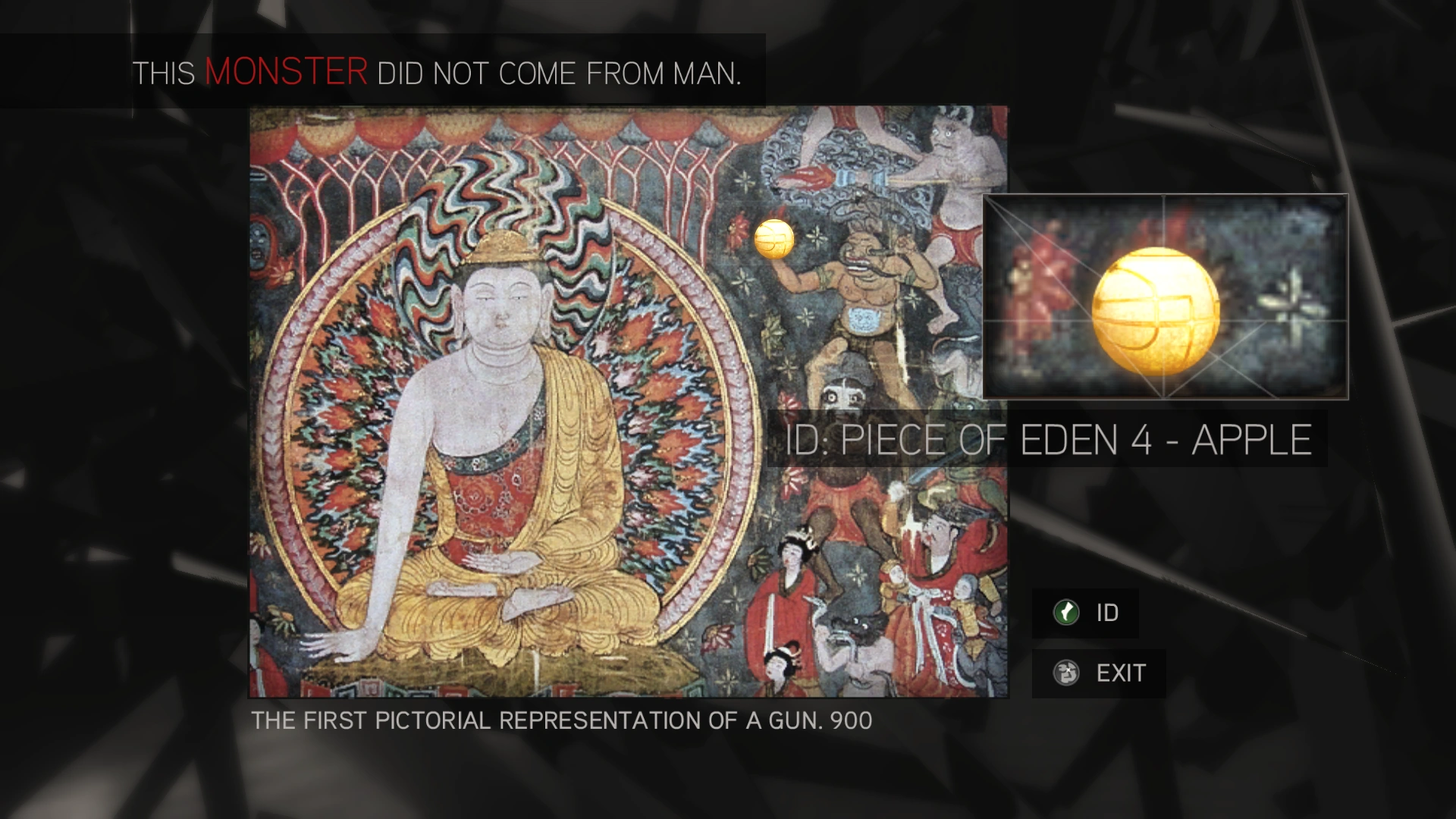 Piramide dell'Eden, un design originale formato da una serie di occhi racchiusi in un trinagolo con una mela che si irradia direttamente sopra di esso. Simboleggia il piano dei Templari di utilizzare la Mela nel satellite Eye-Abstergo per controllare l'intera umanità. | |
