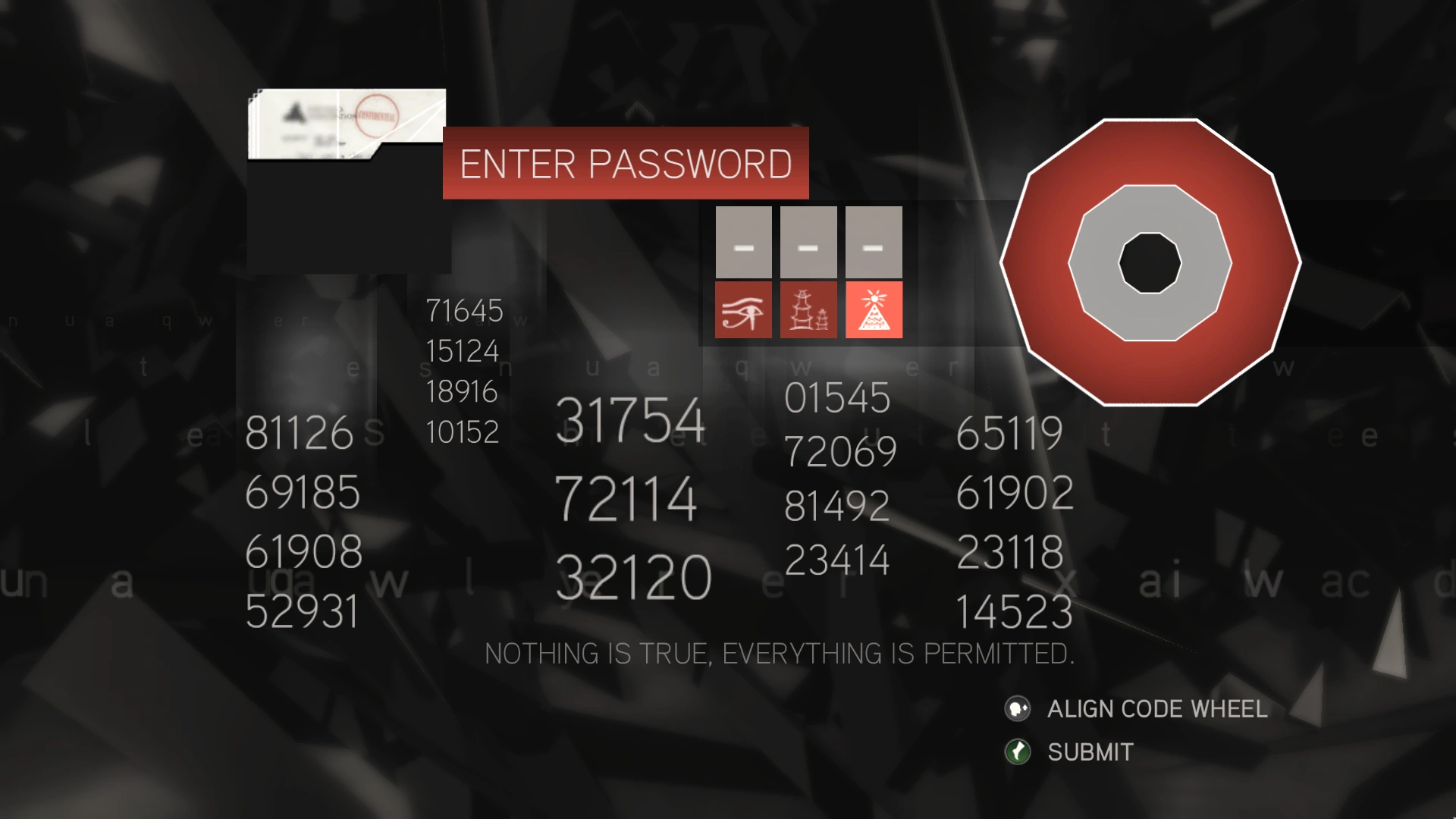Clay programmò i glifi in maniera tale che consentissero l'accesso in un certo ordine ai file che nascondevano, qualunque fosse l'ordine con cui Desmond li avrebbe poi individuati all'interno della simulazione dell'Animus.