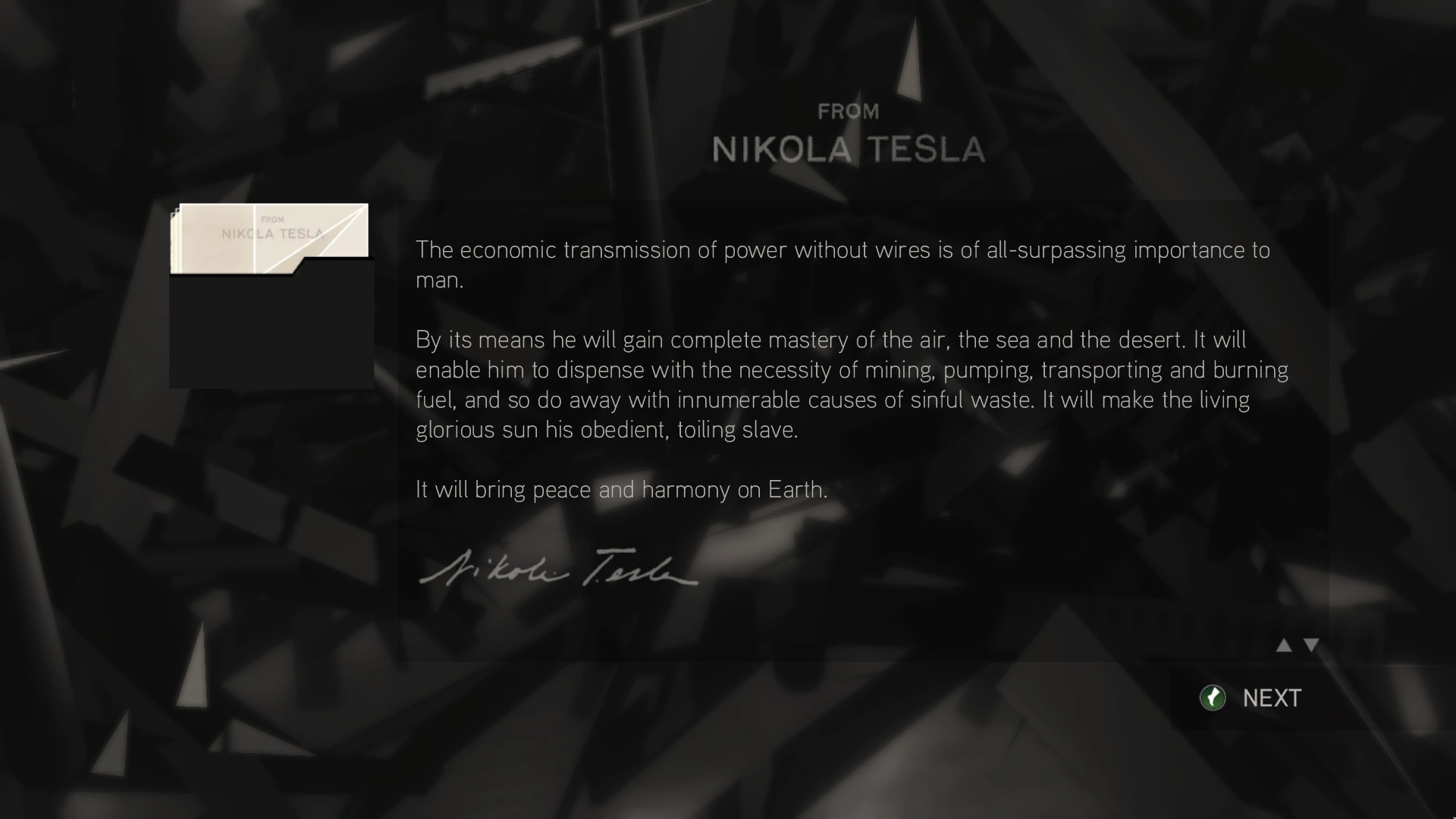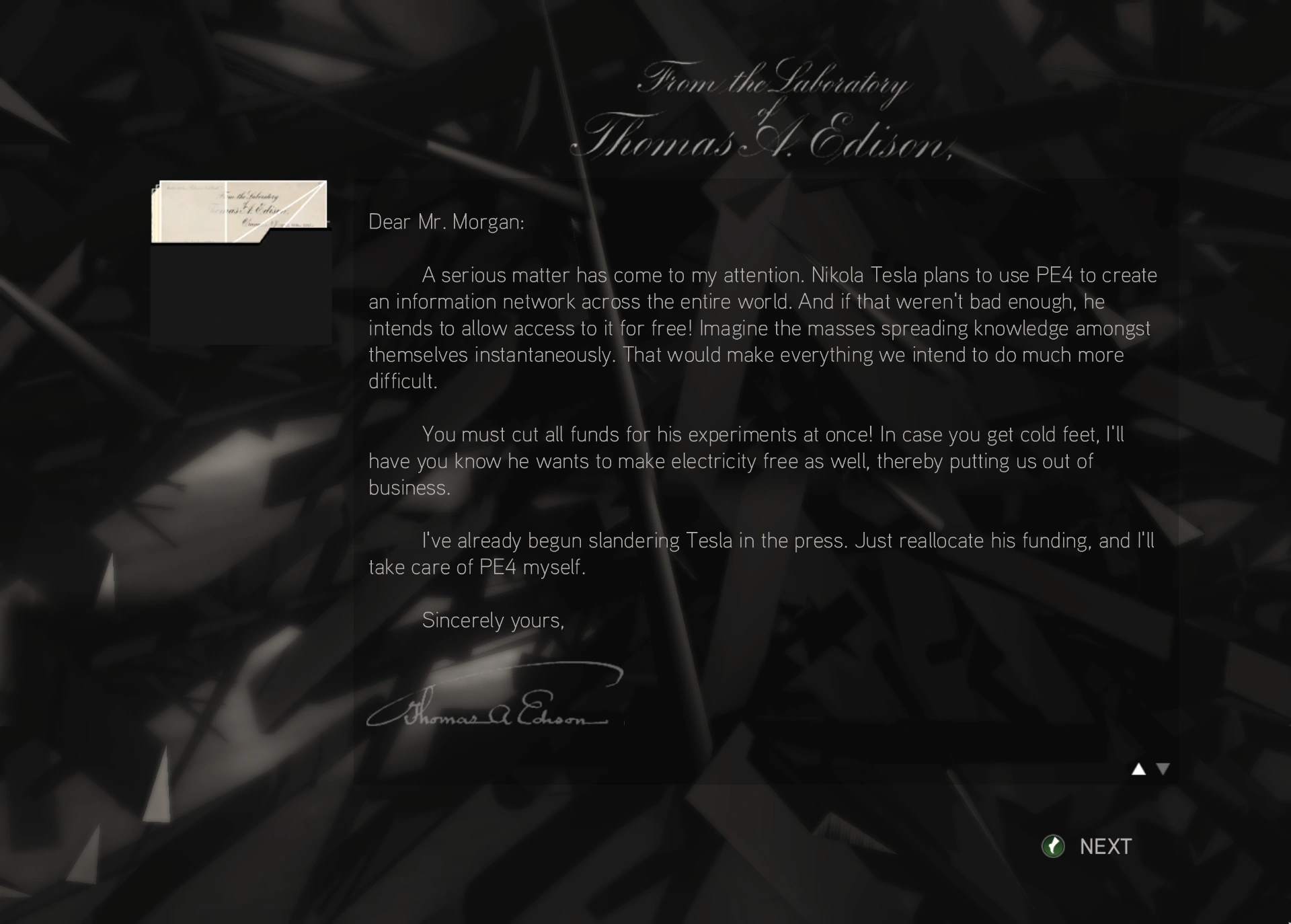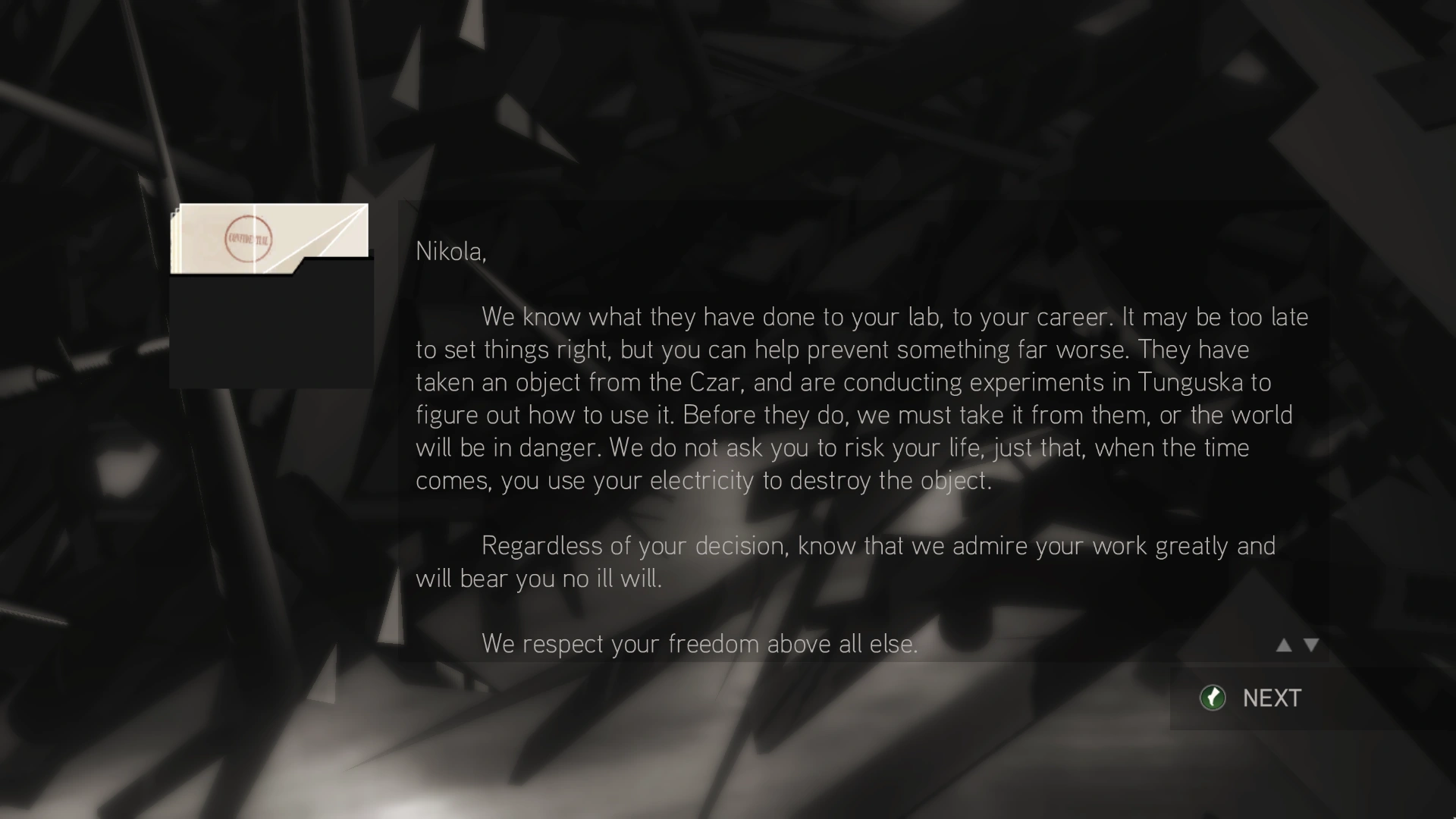 sappiamo cosa hanno fatto al tuo laboratorio, alla tua carriera. Forse è tardi per rimettere tutto a posto, ma sei ancora in tempo per aiutarci e prevenire eventi ancora più disastrosi. Hanno sottratto un oggetto allo Zar, e stanno conducendo esperimenti a Tunguska per scoprirne le potenzialità. Prima che questo accada, dobbiamo rubarlo, altrimenti il mondo sarà in pericolo. Non ti chiediamo di rischiare la vita, ti chiediamo solo, al momento opportuno, di usare la tua elettricità per distruggerlo.