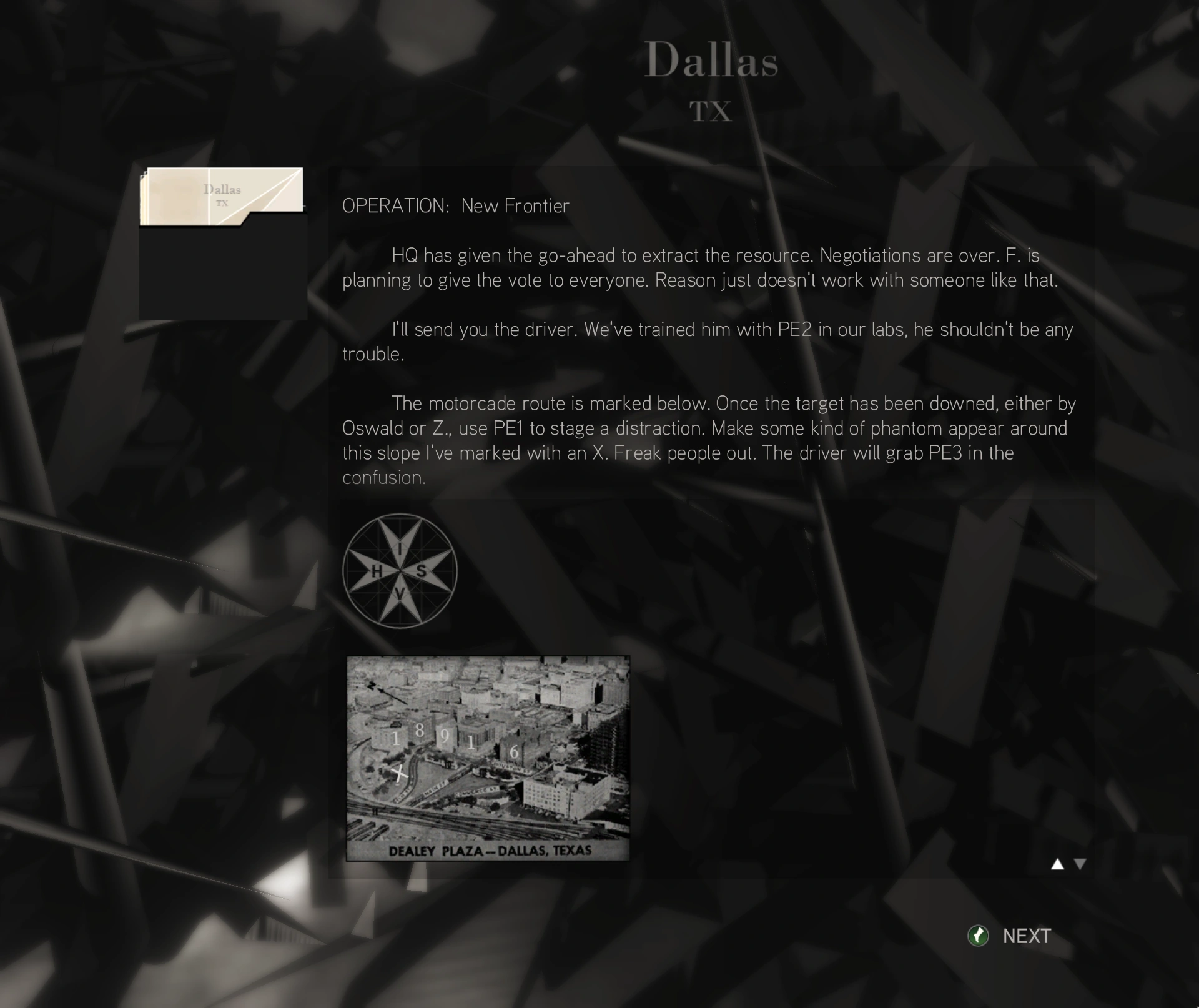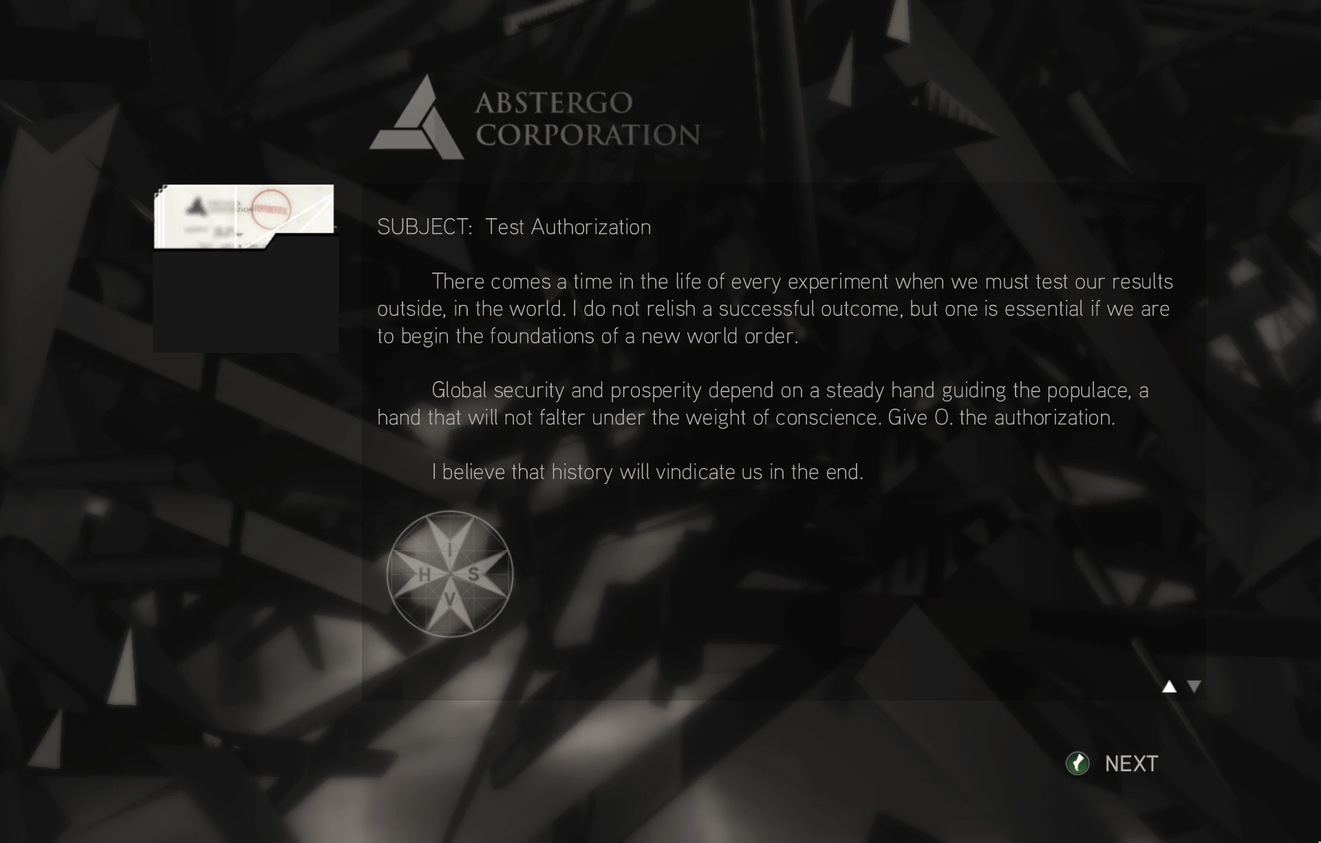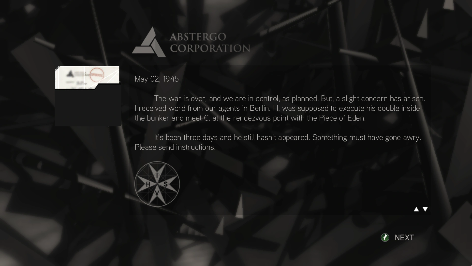 La guerra è finita e, come pianificato, il potere è nelle nostre mani. Tuttavia serpeggia la preoccupazione. Ho ricevuto un messaggio dai nostri agenti a [[Berlino]. H doveva eliminare la sua donna nel bunker e recarsi all'incontro con C nel luogo stabilito, recando con sé il Frutto dell'Eden.