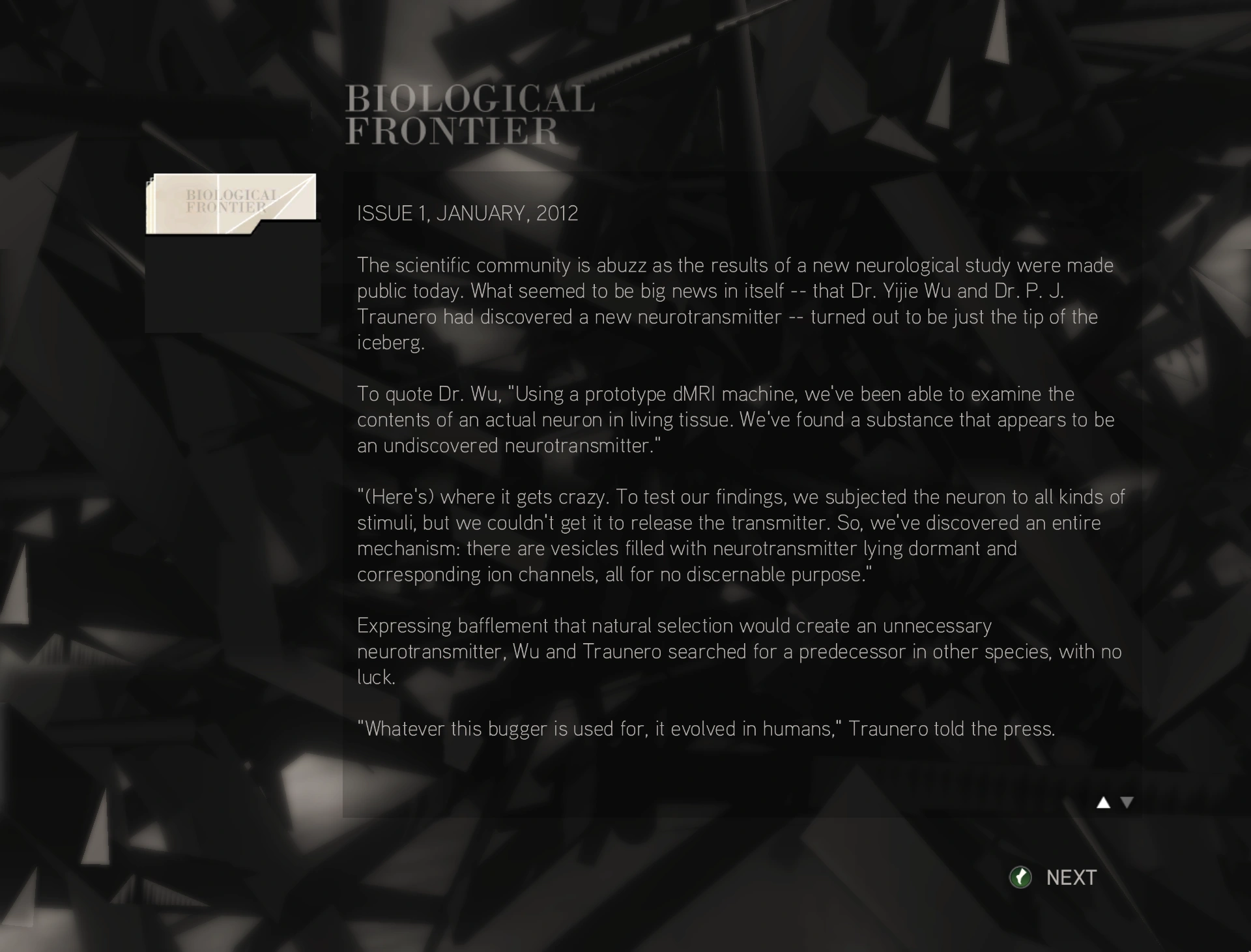 La comunità scientifica è in fermento per i risultati di uno studio neurologico pubblicato quest'oggi. Ciò che sembrava di per sé una notizia grandiosa, il fatto che il dottor Yijie Wu e il dottor P. J. Traunero abbiano scoperto un nuovo neurotrasmettitore, è infatti solo la punta dell'iceberg.