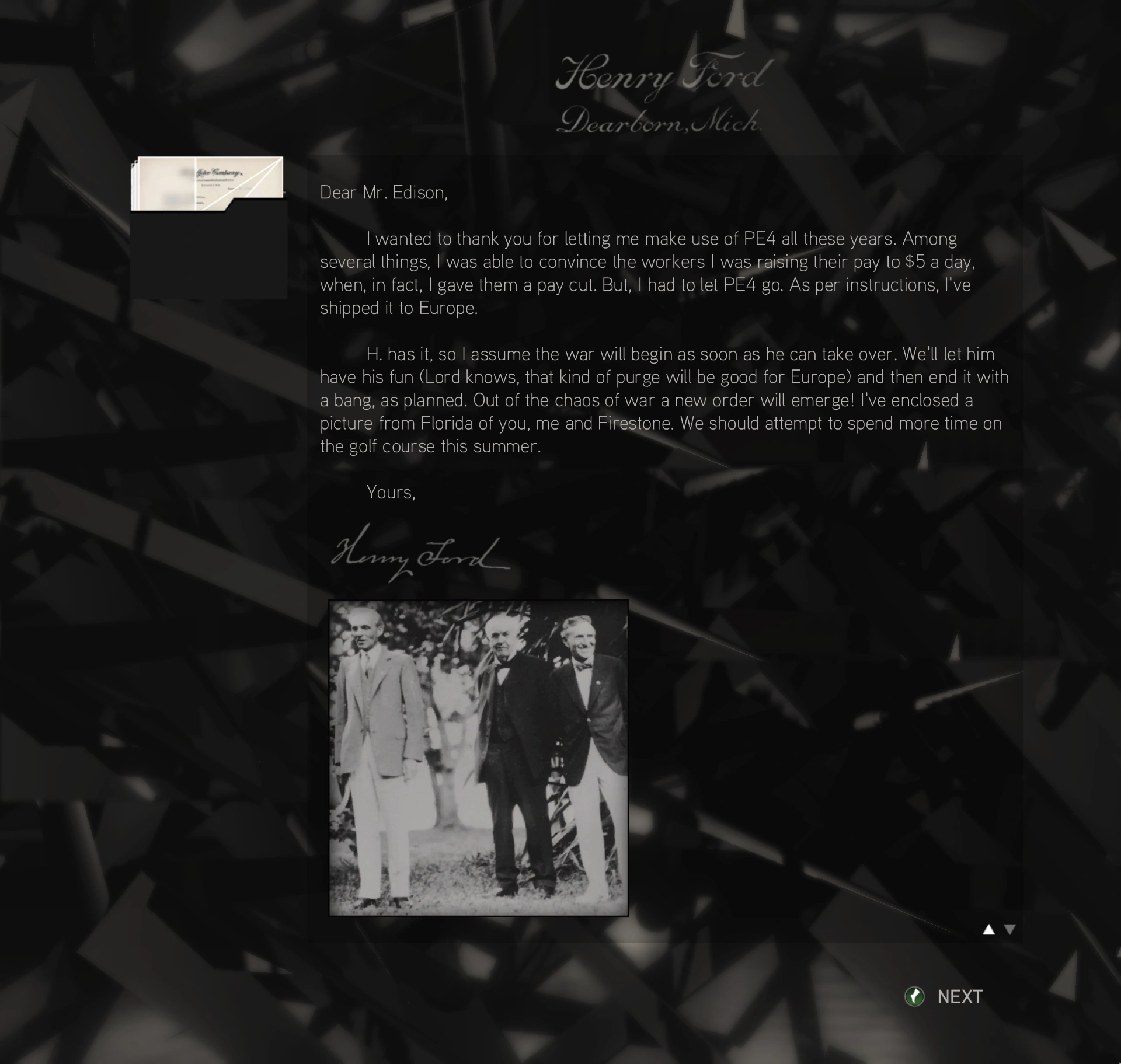 È nelle mani di H, quindi presumo che a breve inizierà la guerra. Lasciamo che si diverta (questo genere di purghe fanno bene all'Europa), poi metteremo fino a tutto con un grande botto, come previsto. Il caos generato dalla guerra favorirà l'instaurarsi di un nuovo ordine! Le allego una foto scattata in Florida: siamo io, lei e Firestone. Quest'estate dovremo assolutamente dedicare più tempo al golf.