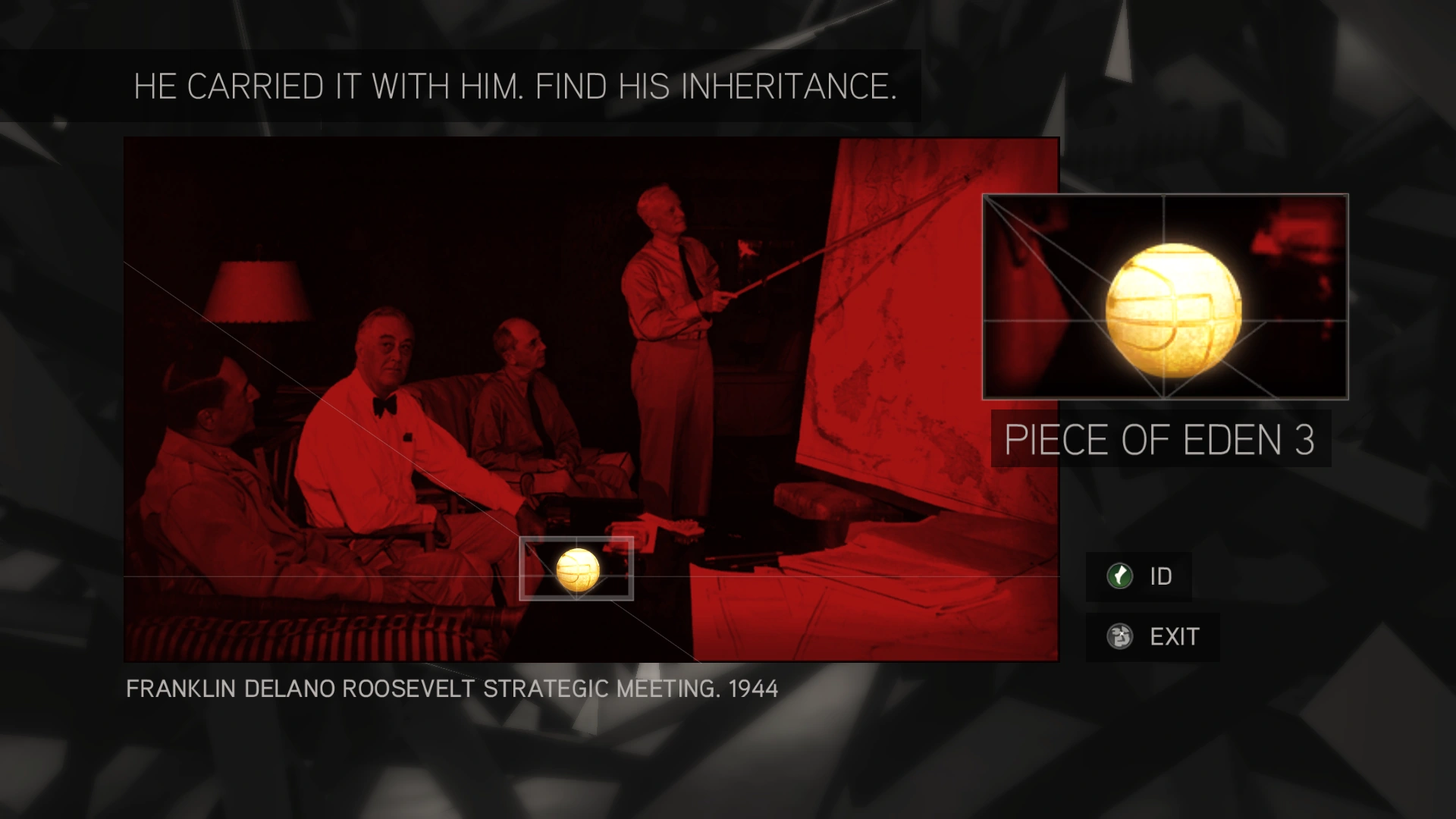 Rebecca e Shaun indicarono a Desmond quali edifici presenti all'interno della simulazione recavano un glifo sulle proprie mura in maniera da aiutarlo nella ricerca. Ogni volta che un glifo veniva scansionato attraverso l'occhio dell'aquila, permetteva l'accesso ad una serie di enigmi, che una volta risolti mostravano importanti informazioni riguardanti la storia dei Templari, dell'umanità e dei Frutti dell'Eden. Inoltre, terminata ogni serie di enigmi, gli Assassini ottennero l'accesso ad un frammento del video noto come "La Verità". Dopo aver individuato tutti i glifi e risolto tutti gli enigmi a loro associati, gli Assassini riuscirono a visionare l'intero video del ricordo rivissuto da Clay, senza però comprenderne in fondo il significato.[2]