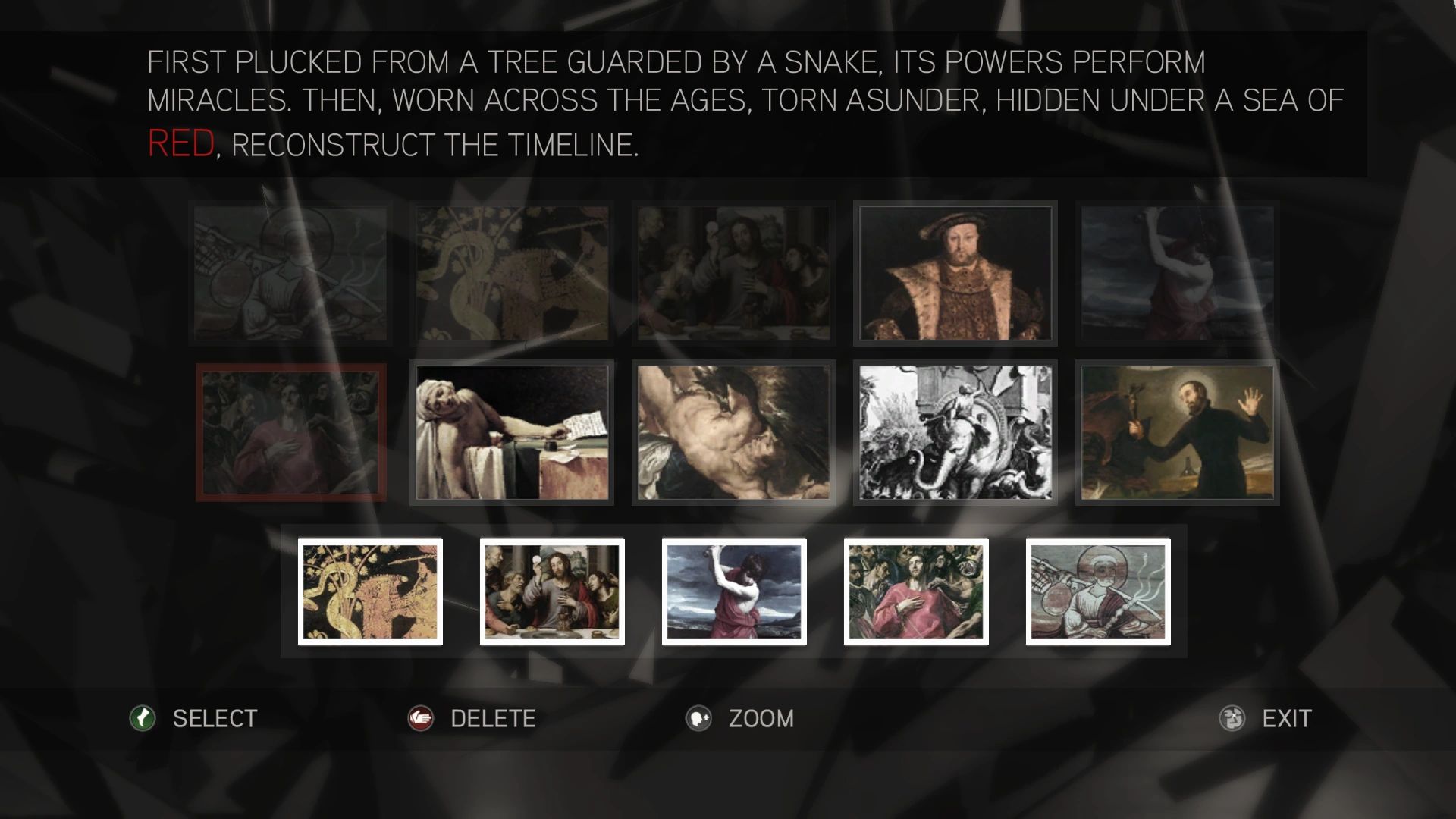 Colto la prima volta da un albero difeso da un serpente, i suoi poteri compiono miracoli. Poi, logorato nel corso dei secoli, lacerato, nascosto sotto un mare di rosso, ricostruisci la linea cronologica.