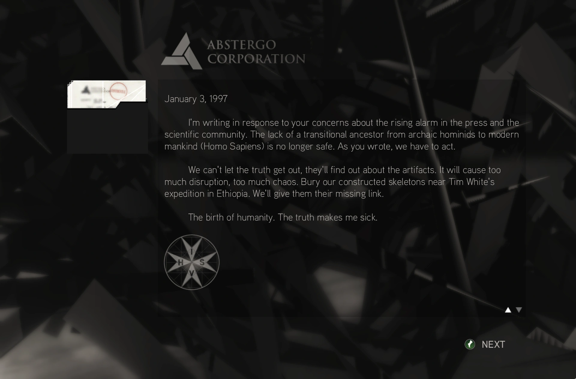 Non possiamo lasciar trapelare la verità, o si saprà dei manufatti. Questo causerebbe il caos, la distruzione. Seppellisci i finti scheletri vicino al campo della spedizione di Tim White, in Etiopia. Daremo al mondo l'anello mancante che desidera.
