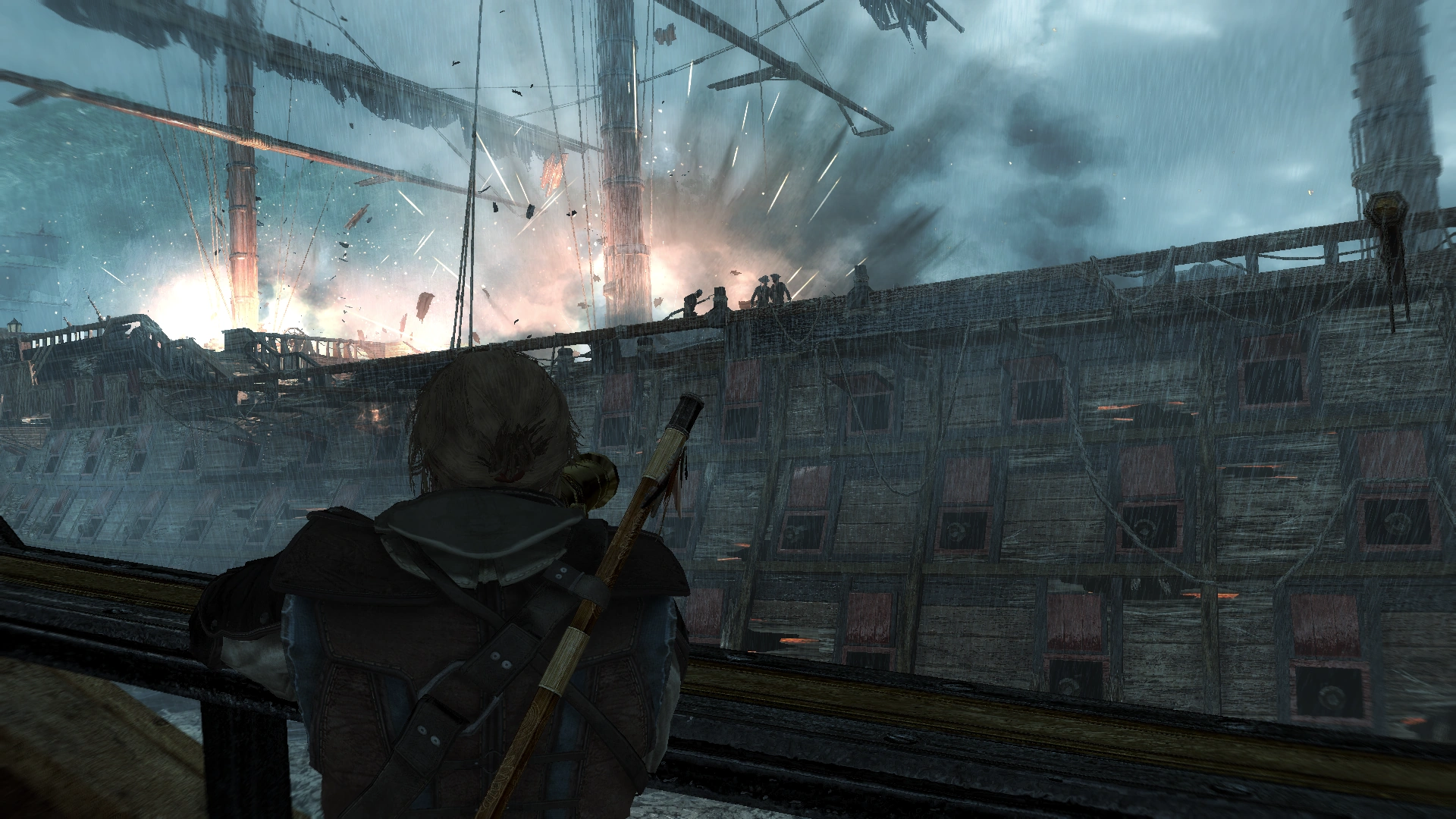 Edward osserva i danni riportati dalla Jackdaw nella tempesta.
