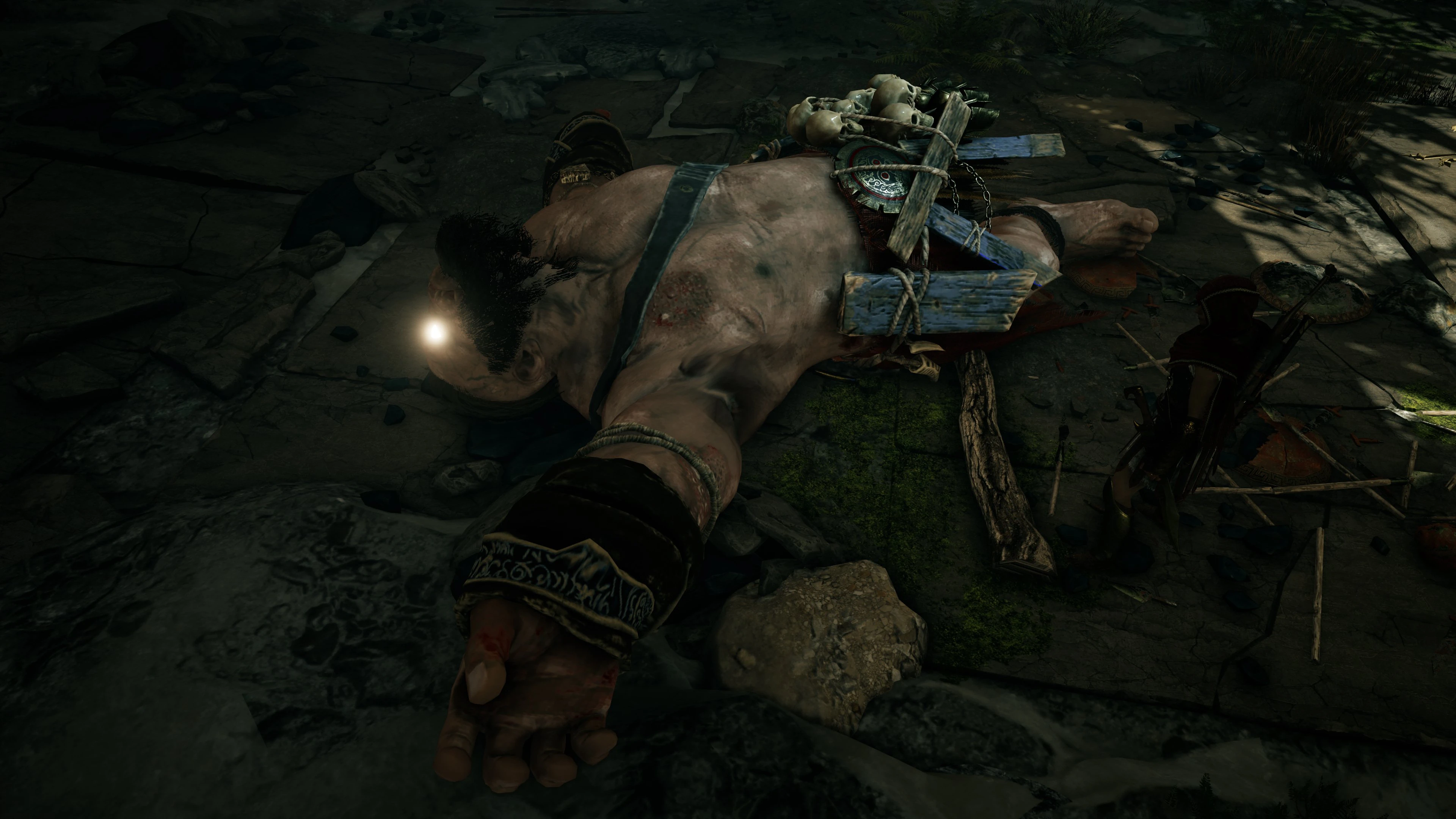 Nataka inviò Kassandra alla ricerca di un informatore nei pressi delle paludi di Thermes, dove liberò una donna che la informò della cattura di suo figlio, l'informatore di Nataka, da parte dell'Ordine. Kassandra riuscì a trovare il ragazzino, timoroso che lei l'avrebbe ucciso. Mentre lo seguiva trovò un albero pieno dei cadaveri impiccati di uomini che aveva ucciso a Potidea. Lì venne affrontata da un uomo mascherato che le disse di non fidarsi di Dario, che non le stava raccontando tutta la verità su di sé. L'uomo era anche intenzionato a mostrarle il dolore che aveva provocato con tutti gli omicidi che aveva commesso, chiamando a sé i parenti delle sue vittime. L'uomo mascherato lasciò poi il posto, lasciando dietro sé un messaggio in cui vi era scritto che il Cacciatore avrebbe atteso nella foresta.