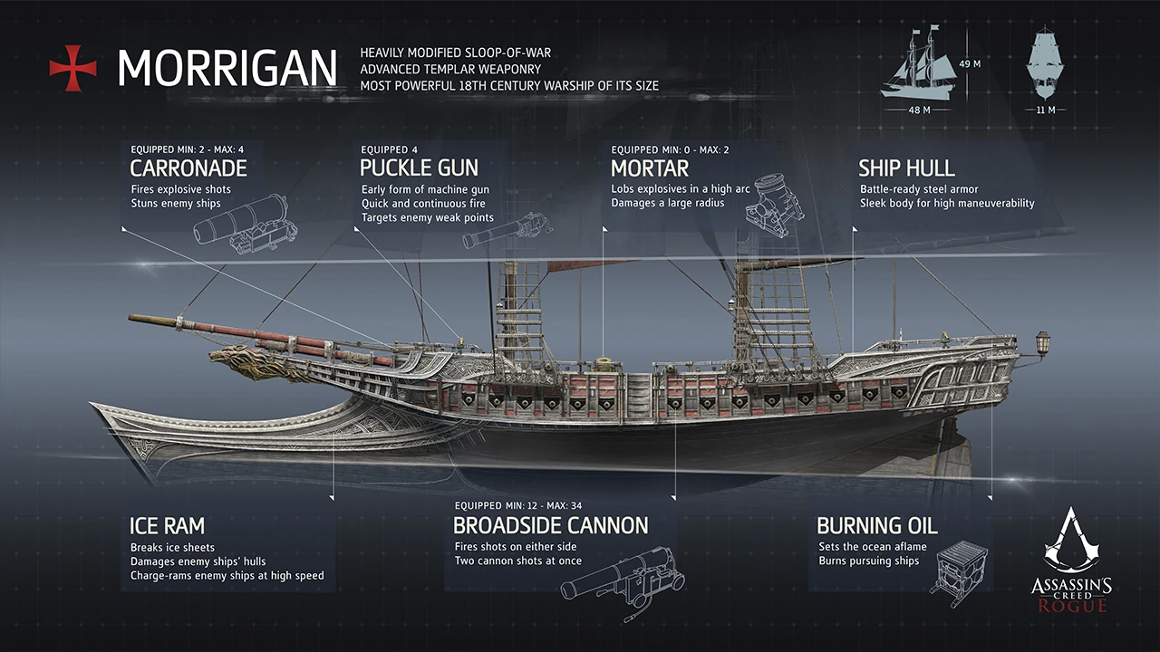 Con gli armamenti e le attrezzature della nave finanziati dalla ricchezza dell'Ordine dei Templari, la Morrigan era una delle navi da guerra più avanzate del suo tempo: era equipaggiata con armi all'avanguardia come i cannoni puckle e l'olio infiammabile. Possedeva anche gli armamenti standard inclusi con 34 cannoni sulla fiancata (con 17 per ogni lato), mortai e uno sperone rompighiaccio. Nonostante la sua minore quantità di cannoni a bordo paragonati alla Jackdaw (23 cannoni su ogni lato), la Morrigan compensò con la possibilità di sparare due volte in rapida successione prima di ricaricarla, permettendole di possedere più velocità e potenza di fuoco. Grazie al design elegante della Morrigan, era molto più veloce e più manovrabile di molte altre navi pur mantenendo una potenza di fuoco superiore alla media per una nave delle sue dimensioni.