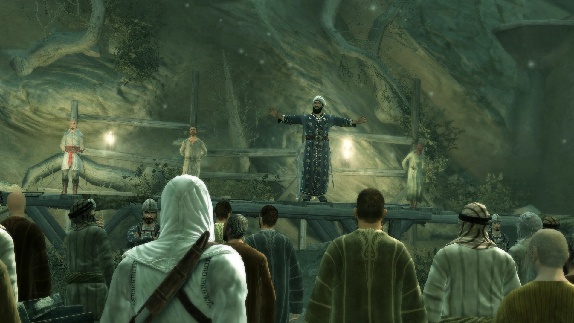 Altaïr made his way to the fortress, killing Templar soldiers and rescuing villagers along the way. Upon arriving at the fortress' gates, was greeted by the traitor. Taunting Altaïr, the traitor closed the gates behind him as he went to execute the captured Assassins, which included Al Mualim himself, in the courtyard with a crossbow. With Altaïr locked out of the fortress' gates, he managed to climb up some scaffolding on the outside to get onto the walls. From there, he ran along the walls and jumped onto a tiled roof of a balcony, before he assassinated the traitor from above, saving Al Mualim from being killed in the process.[4]