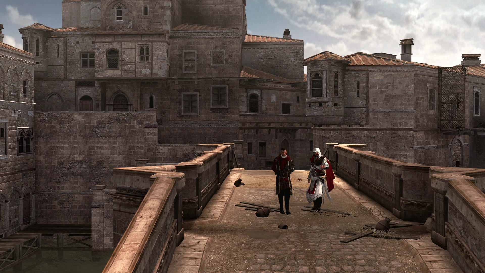 Buiten liepen Ezio en Machiavelli samen over een brug over de rivier de Tiber.