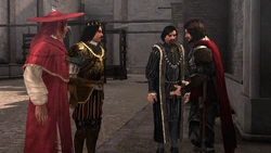 Valois requiriu a rendição de Bartolomeo e os mercenários, mas Ezio e Bartolomeo conseguiram impedir o ataque. Vendo seus inimigos por trás do portão, Valois trocou insultos com Bartolomeo, o chamando de bárbaro e pedindo que ele lhe encontre em sua fortaleza para declarar sua rendição.