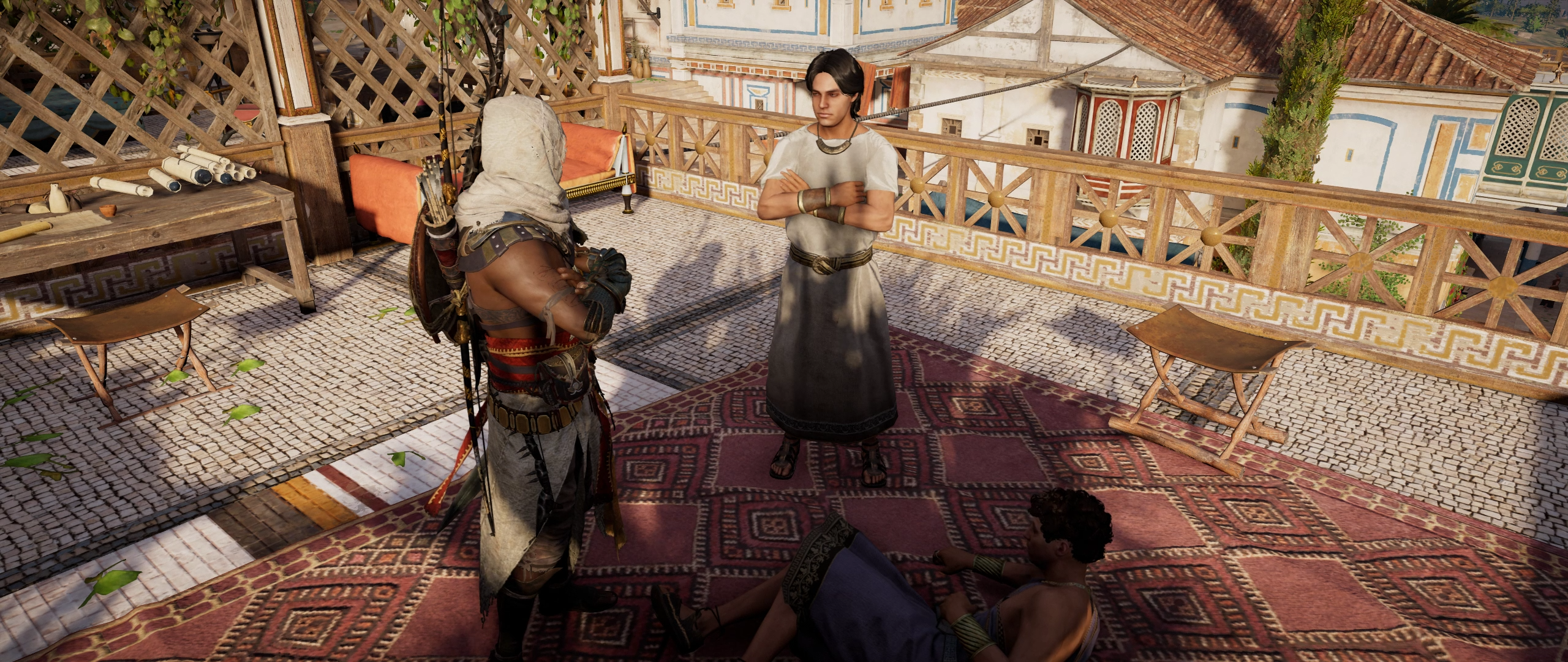 Bayek placed Simonides on a mat.