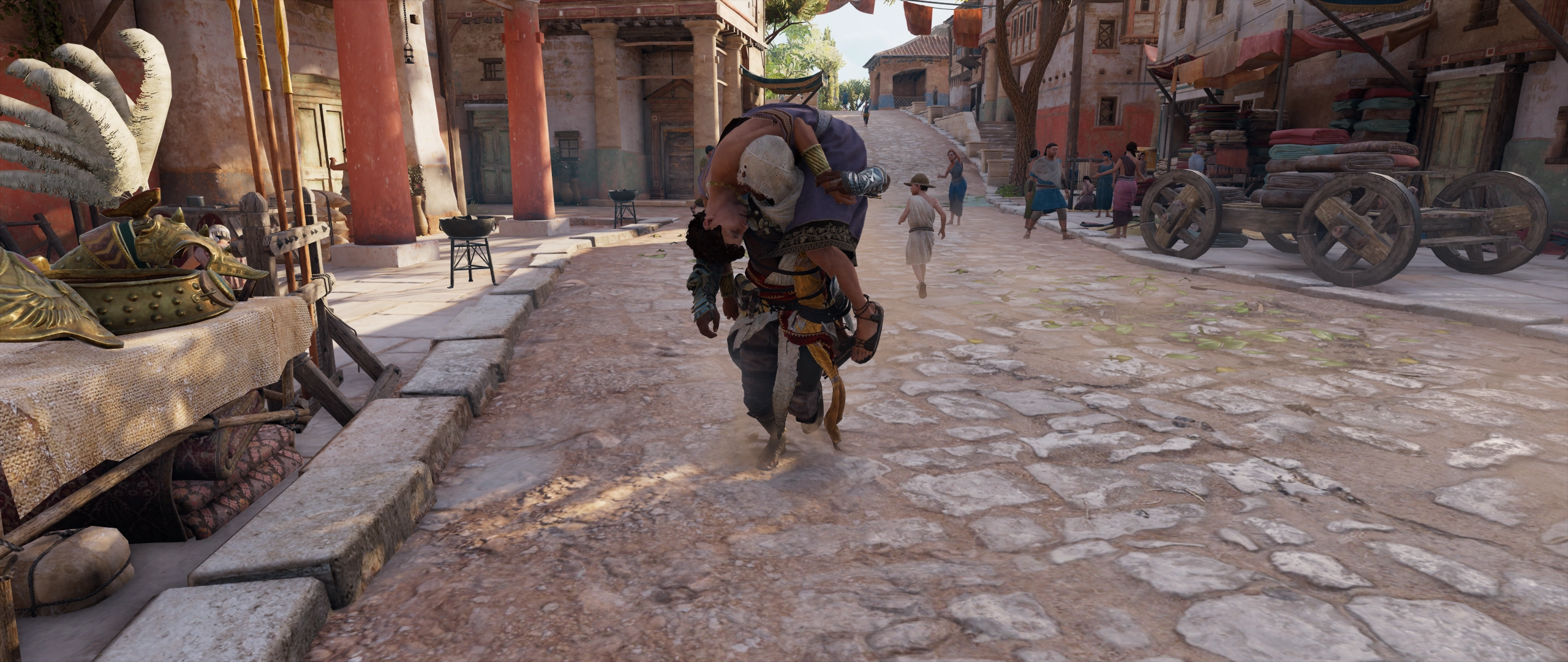 Bayek carrying Simonides to Diocles' home