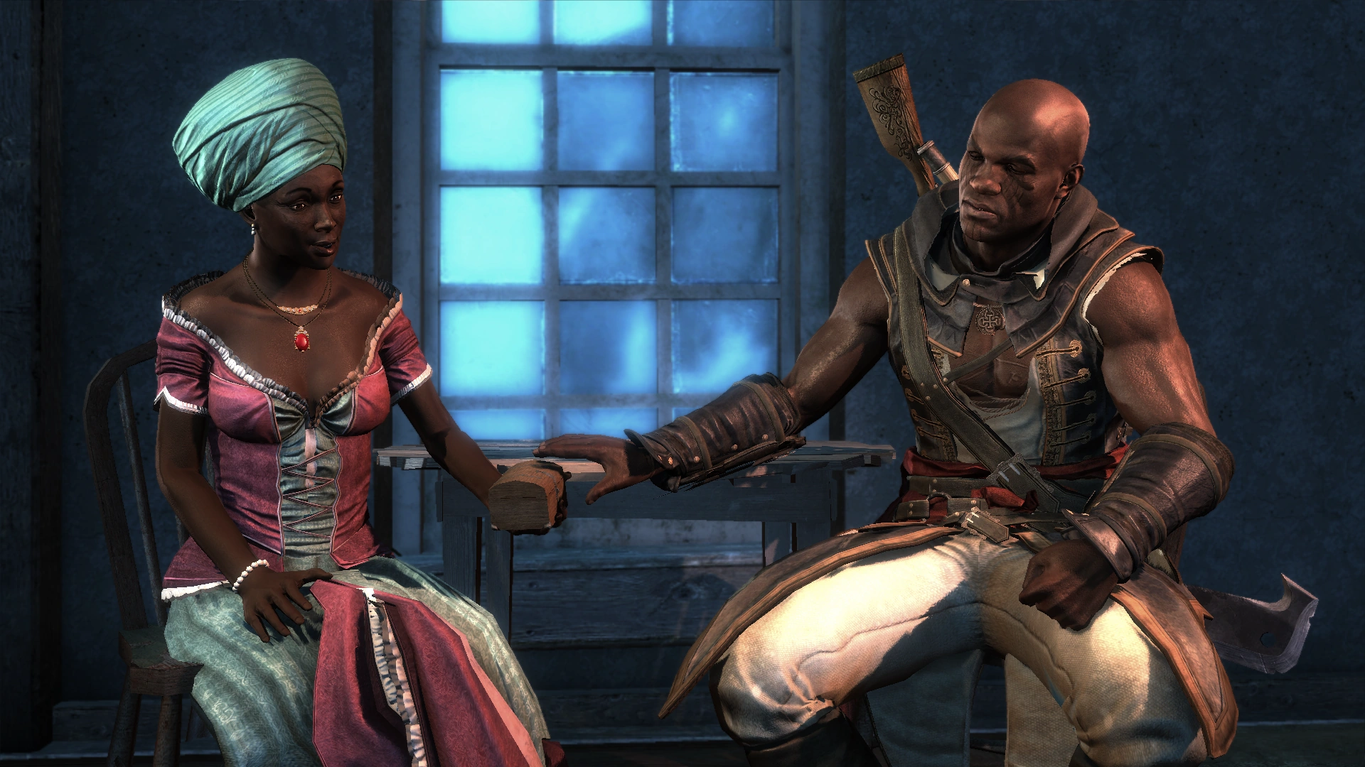 During his time in Port-au-Prince in 1737, Adéwalé shared a night of passion with Bastienne; she became pregnant and eventually bore a son.[5] Adéwalé continued to serve the Assassin Order and, at some point, was assigned on a mission alongside Liam O'Brien, whom the latter came to respect greatly.[4] Adéwalé returned to Port-au-Prince to offer aid following an earthquake in 1751. There he met his son, Babatunde, and thereafter took him to join the Brotherhood.[5]