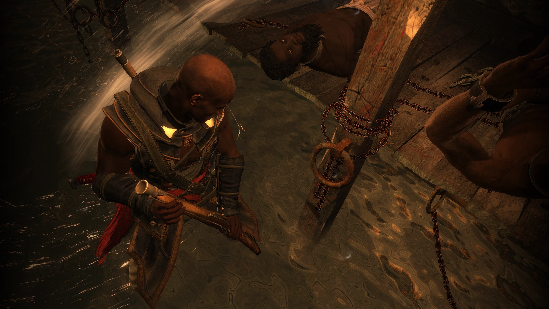 Due to Adéwalé being fluent in English, French and Spanish, his captors eventually decided to send him to Spain to be an interpreter, and had him imprisoned aboard a ship in the Spanish Treasure Fleet for passage. Adéwalé found himself chained alongside the pirate Edward Kenway, who was also destined for Spain. Together, the two broke free of their bonds and, after incapacitating a number of guards, procured themselves a ship, in the process freeing a number of likewise captured pirates.[1]