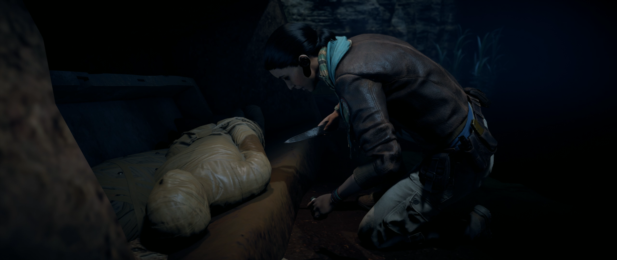 In 2017, Bayek and Amunet's tomb was discovered by Layla Hassan, an Abstergo Industries employee performing excavation work in the Hotep Cavern. After reliving Bayek's memories in her portable Animus HR-8, Layla experienced a Bleeding Effect-induced hallucination of Amunet leading her to her sarcophagus. Layla subsequently extracted a DNA sample from the mummy and used it to relive Amunet's memories in the Animus alongside Bayek's.[44]