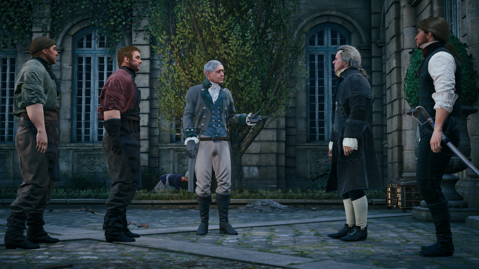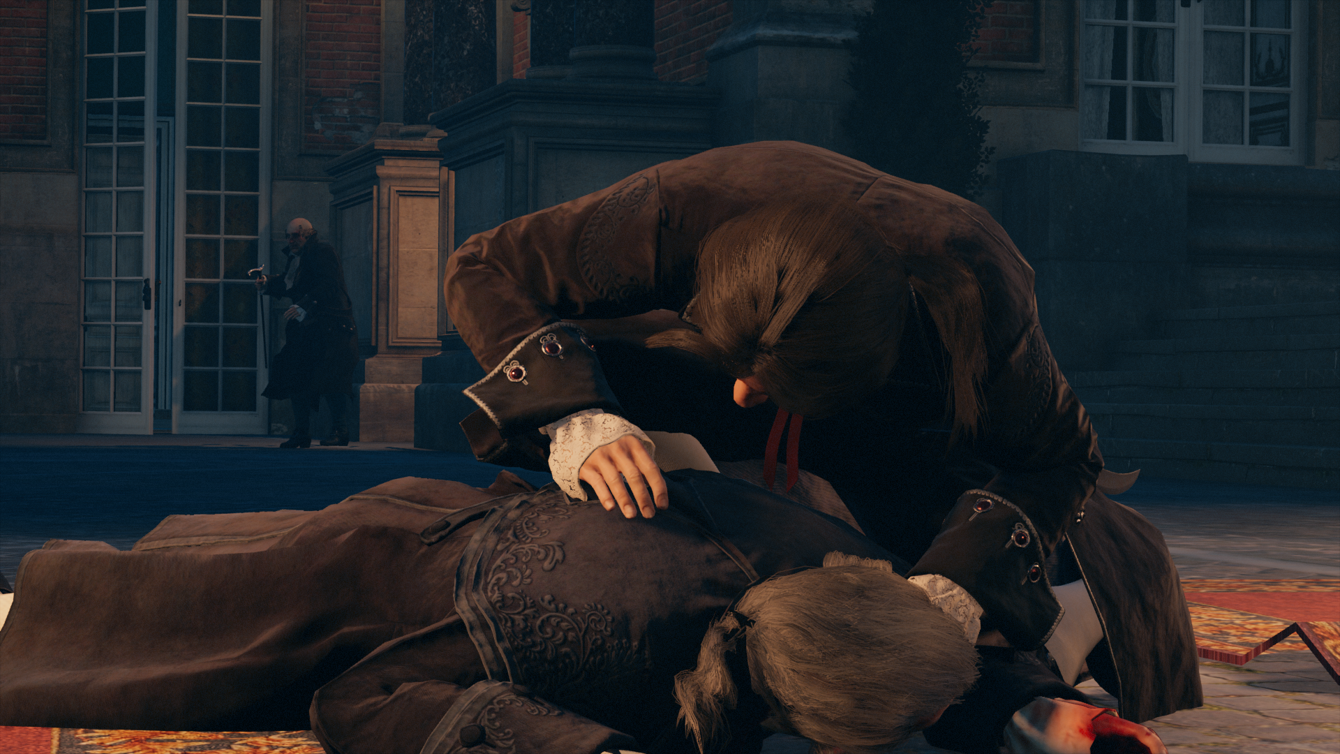 Arno and Élise soon overheard a nearby commotion and, thinking the guards were still after him, Arno confessed to stealing an apple. When the guards ignored him and continued onwards, Arno and Élise followed them at her urging to see what was going on. Seeing a large crowd gathered around a deceased body, Arno made his way through the crowd and discovered that the corpse was his father's,[4] as Charles had been assassinated by an uncaught man.[5]