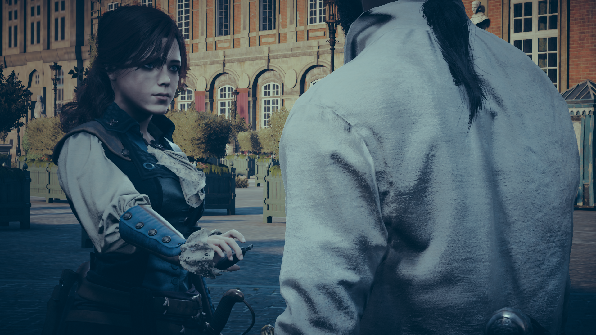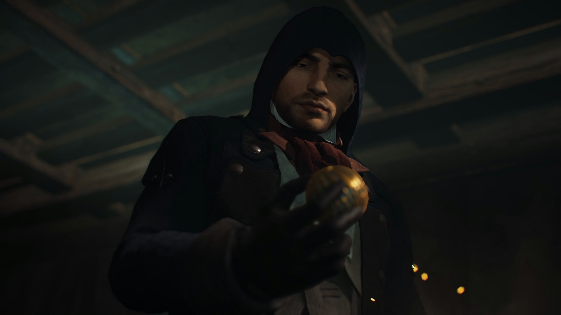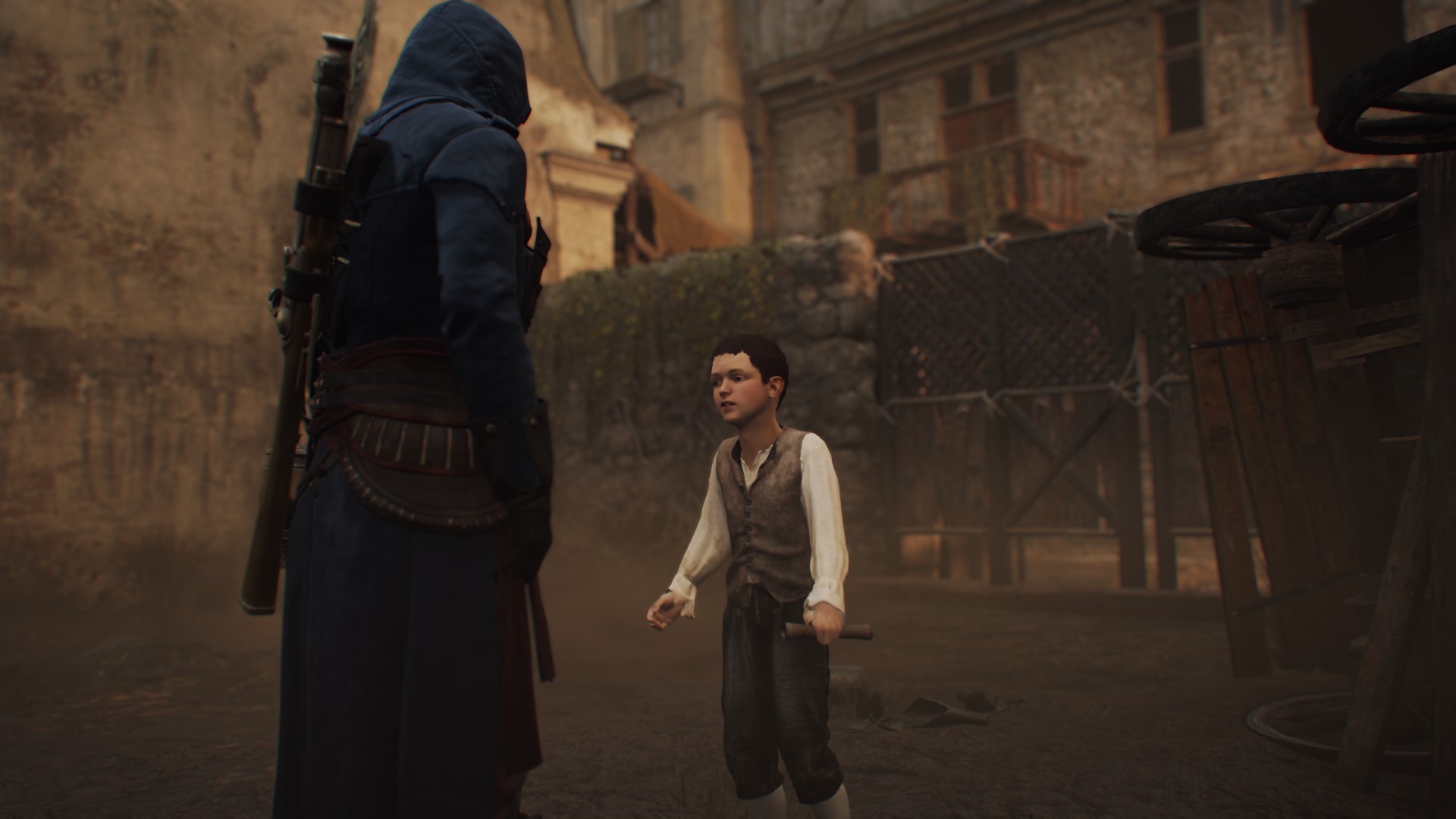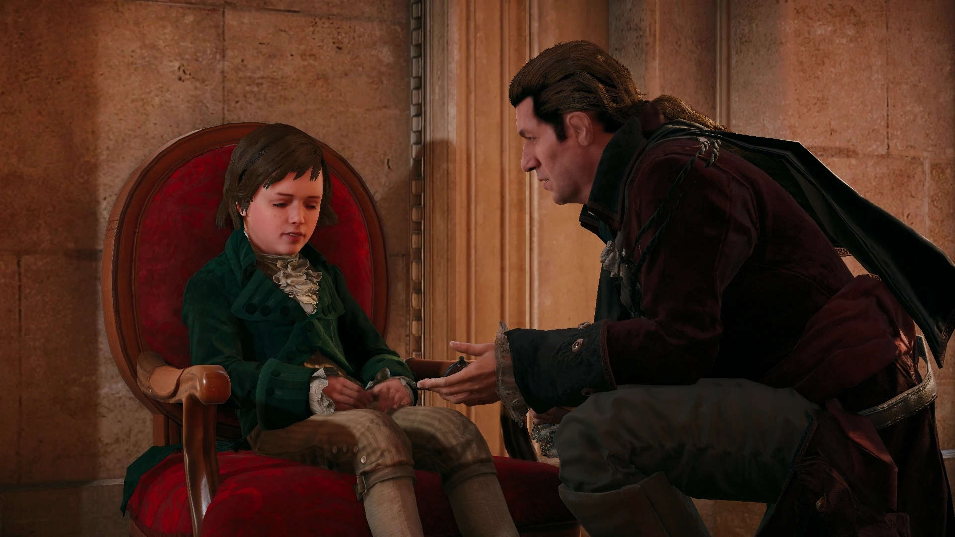 While waiting, a bored Arno saw a mysterious young girl who enticed him into chasing her. As soon as he caught up to the young girl, she encouraged him to steal an apple from a nearby bowl, prompting several guards to chase him away. Arno then introduced himself to the girl, who in turn introduced herself as Élise and claimed that she was there with her father, who had gone to meet with King Louis XVI.[4]