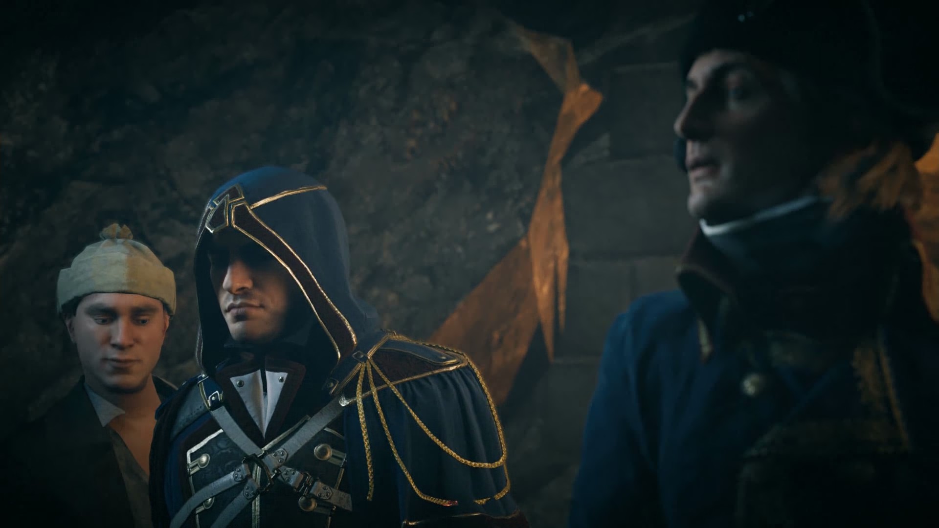 Jumping into the hole, Arno found himself in a series of underground tunnels and was soon greeted by Bellec, who brought him before the French Assassin Council composed of Mirabeau, Sophie Trenet, Guillaume Beylier, Hervé Quemar, and Bellec himself. When Mirabeau questioned his decision to join the Brotherhood, Arno expressed his desire to to redeem his mistakes. While some Council members were reluctant to let Arno join, Bellec vouched for him and Mirabeau authorized Arno to pass the ceremony known as the "eagle's path".[13]