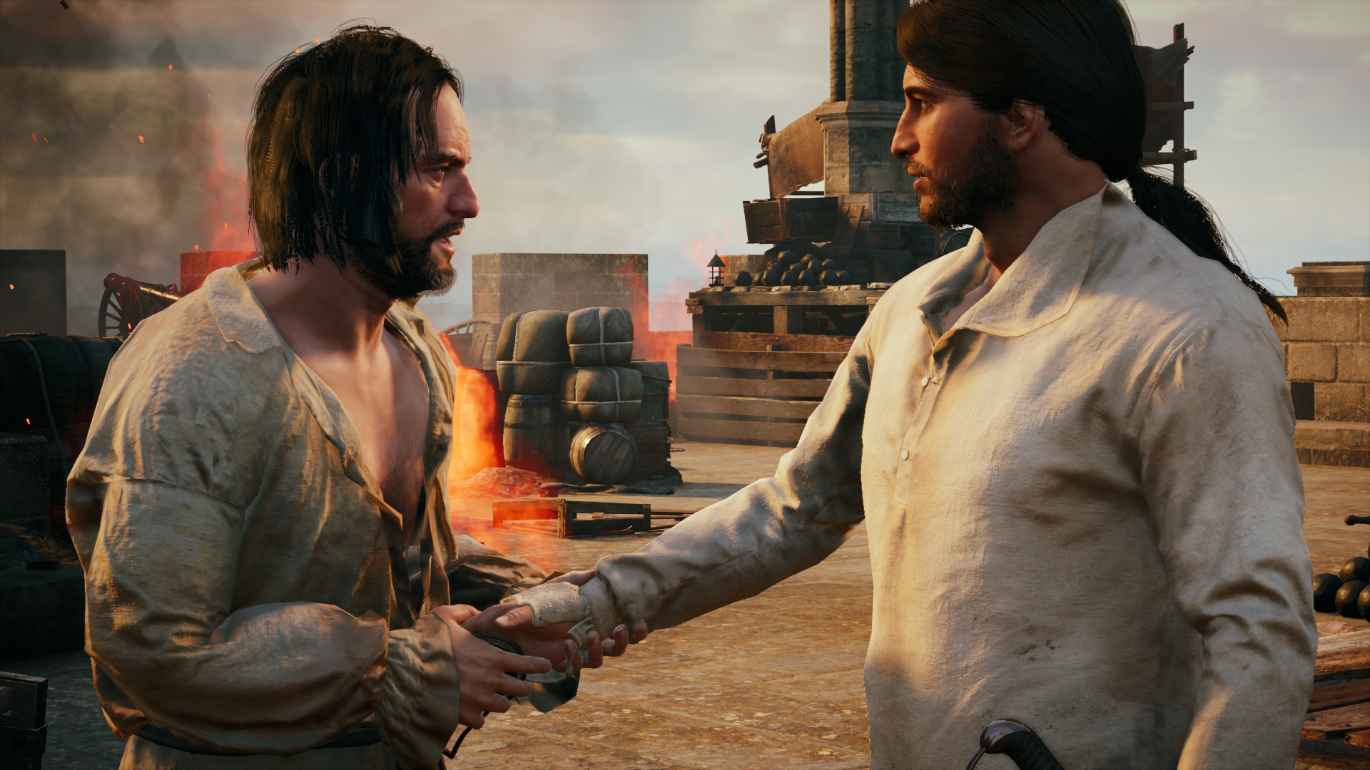 Back in the temple chamber, Arno was able to open the door but was ambushed by Rose, who shot at him. Arno fell into the depths of the necropolis, losing his lantern in the process. As Rose and his men entered the temple, the rogue captain decided to keep the artifact for himself once he found it. While Arno was looking for a way to return to the chamber, Léon arrived and tossed him back his lamp to light his way.[128]