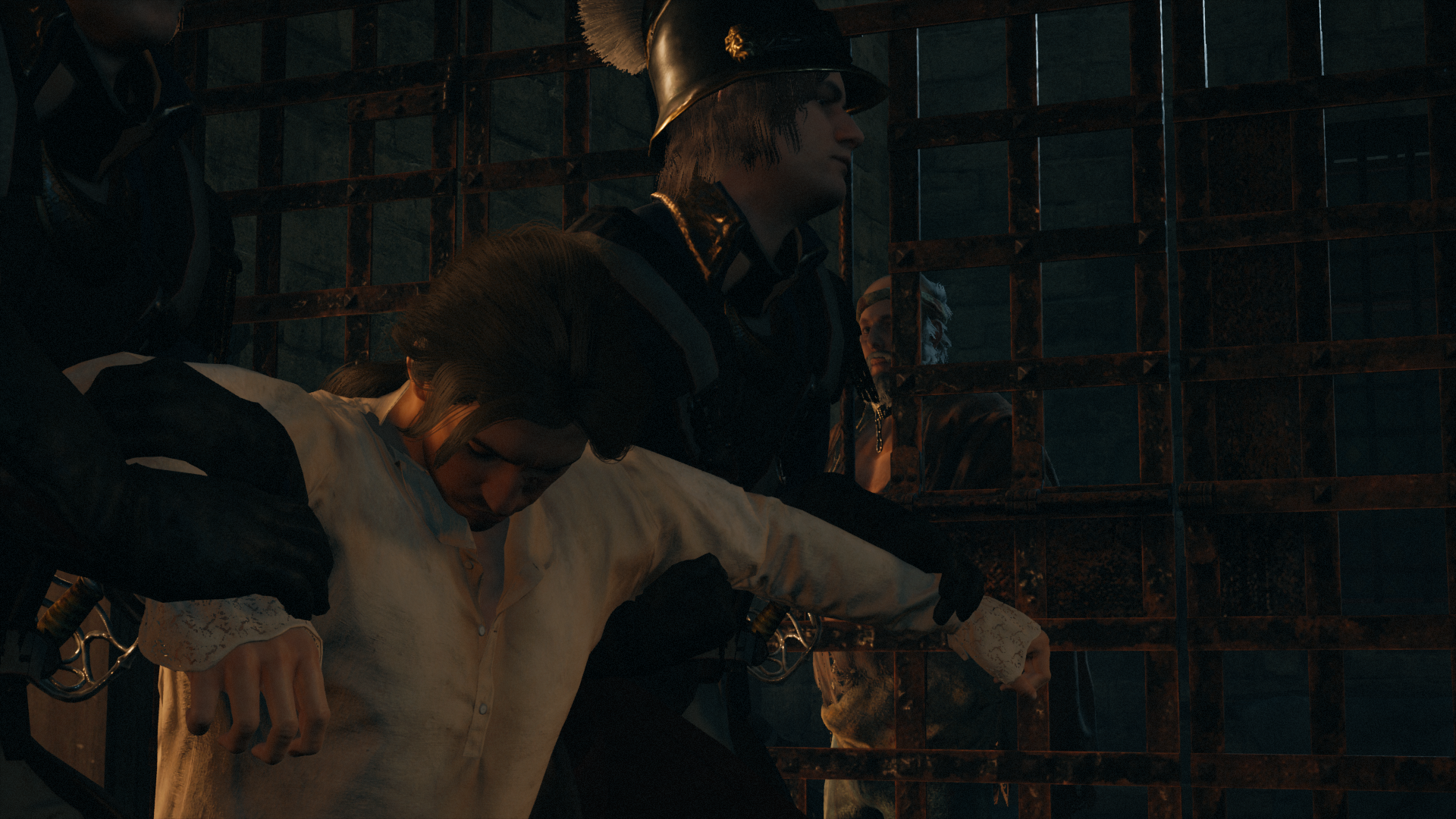 Awakening, Arno found himself being dragged by guards inside a prison. Passing before a cell, Arno saw a naked Marquis de Sade messing with the guards before arriving at his own cell and passing out again. After waking up, Arno engaged in conversation with his cellmates and Bernard Laroche told him that he was at the Bastille. Seeing a wall with strange drawings, Arno tried to speak with the prisoner next to them but the soured cellmate only responded by calling him "pisspot". Arno next tried to call out to the guards to explain his innocence, but they all dismissed him.[12]