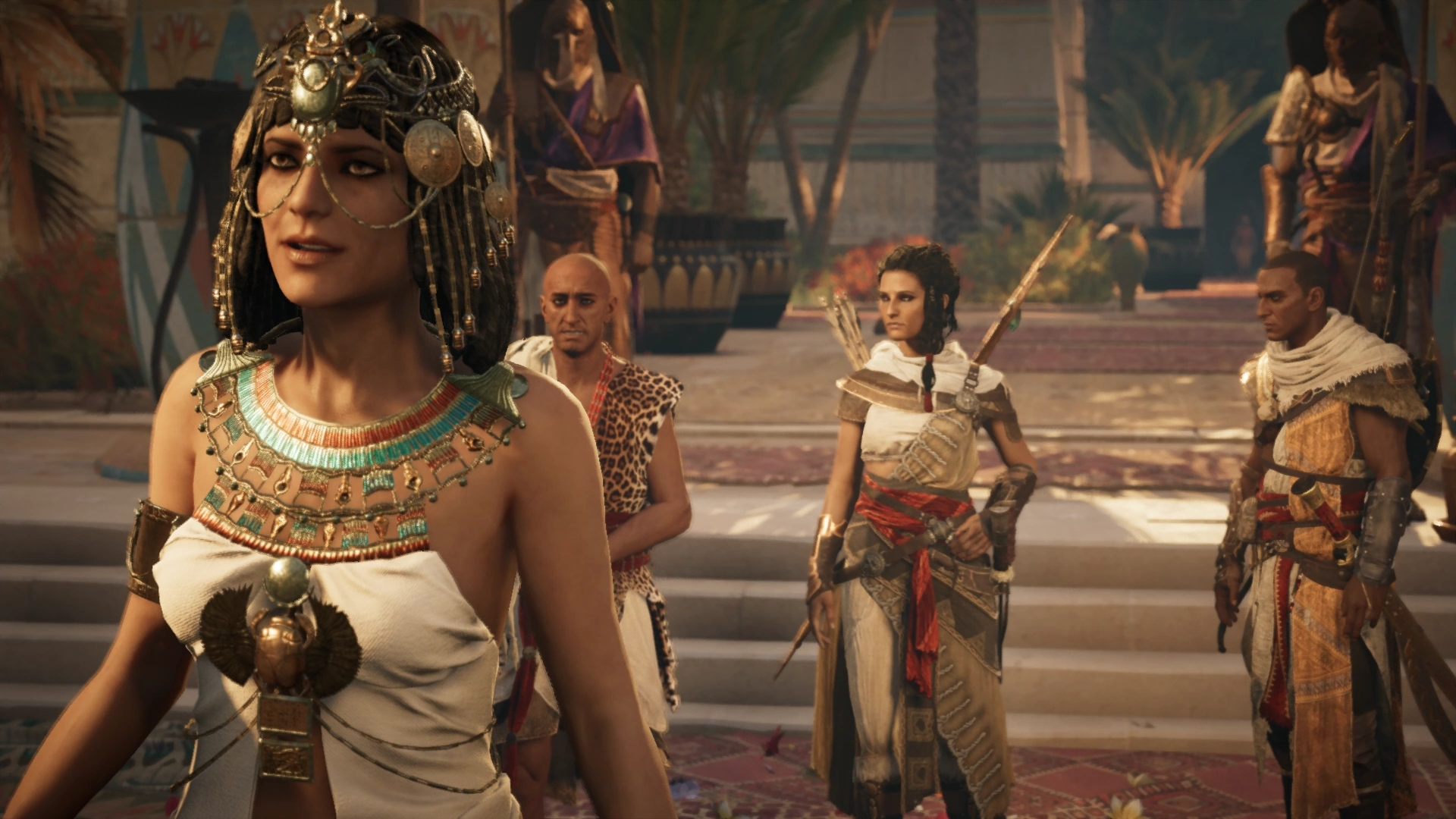 The player takes on the role of a Medjay named Bayek and his wife Aya, as they work to protect the people of the Ptolemaic Kingdom during a time of widespread upheaval: the Pharaoh, Ptolemy XIII, struggles to maintain his rule whilst harboring ambitions of expanding his kingdom; his sister, the recently deposed Queen Cleopatra, begins marshalling loyalist forces to launch a counter-coup against Ptolemy; and frequent incursions into the Kingdom by the Roman Republic under the command of Julius Caesar lead to fears of an imminent invasion.