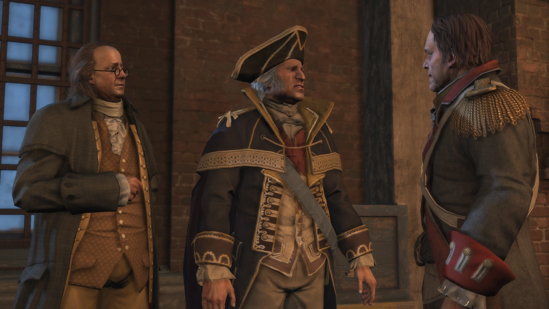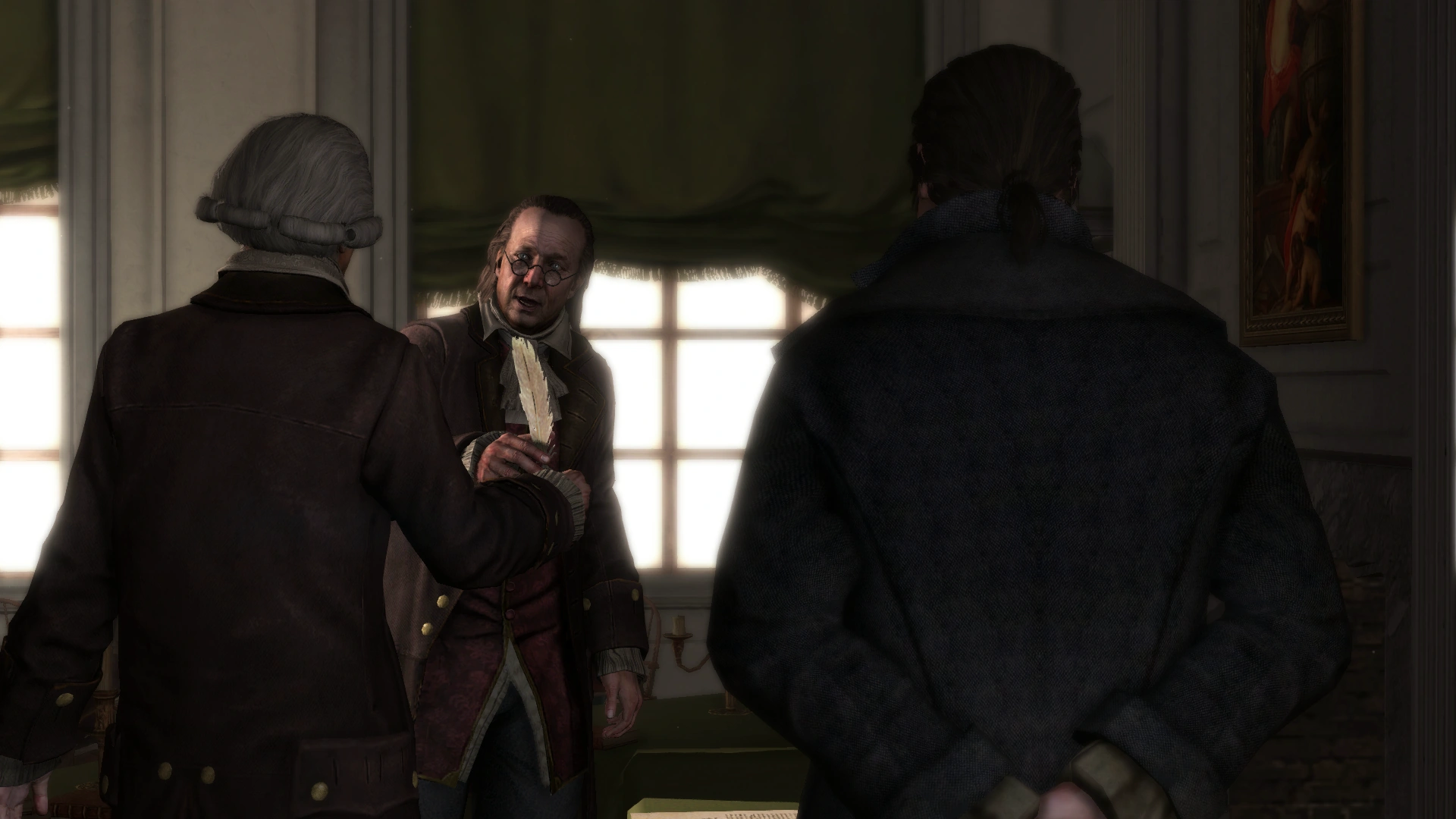 The two rendezvoused with Thomas Jefferson's rebels. While Ratonhnhaké:ton stirred unrest in the city, Franklin suggested watching a rally Washington was giving to get a sense of how large his forces were. Ratonhnhaké:ton's work paid off, turning the citizens on the king's men, scattering his forces across the city, allowing Jefferson's soldiers to attack the palace. Jefferson and Franklin met with Ratonhnhaké:ton before he entered the palace gates, where Franklin gave him the key to open the throne room.[7]