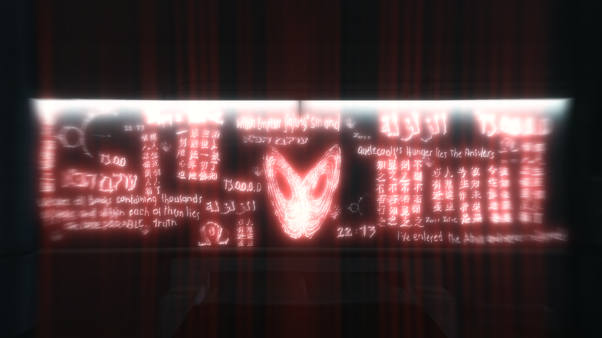 Within each, Desmond solved a cluster puzzle, which then unlocked a piece of a file. Upon compiling them, they revealed a distorted video with the message "the miracle is in the execution", suggesting that, unlike the video hidden in the Glyphs, the Rifts instead concealed an executable file. Upon accessing it, Desmond found himself in an unknown area within the Animus, and was able to run through a long virtual maze, similar to those within the Animus Virtual Training Program.[11]