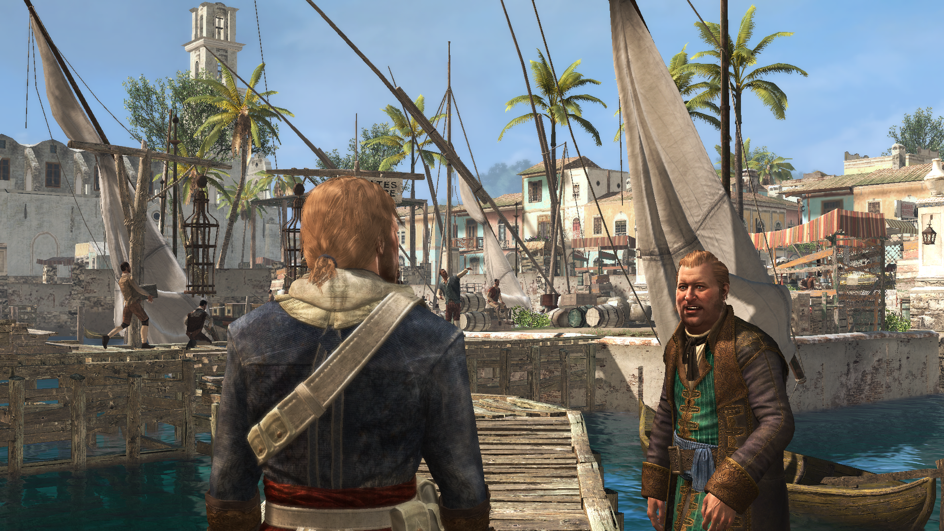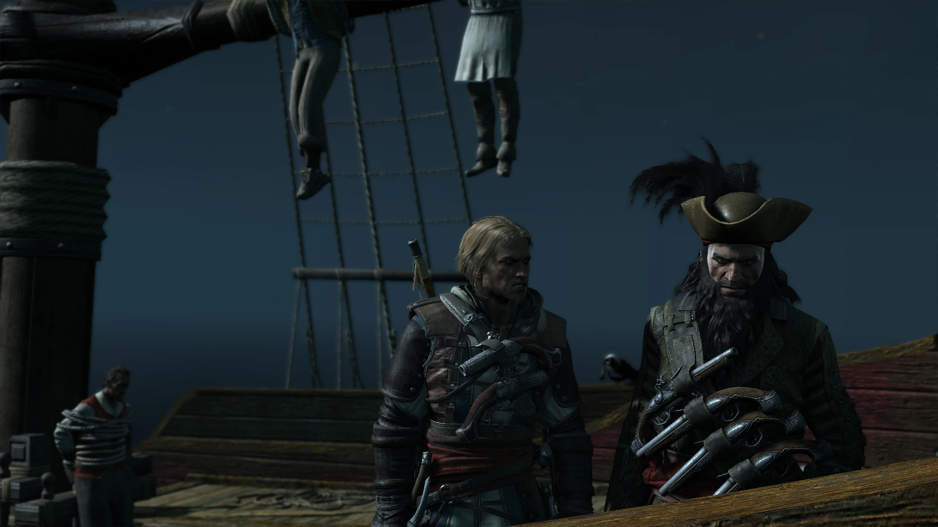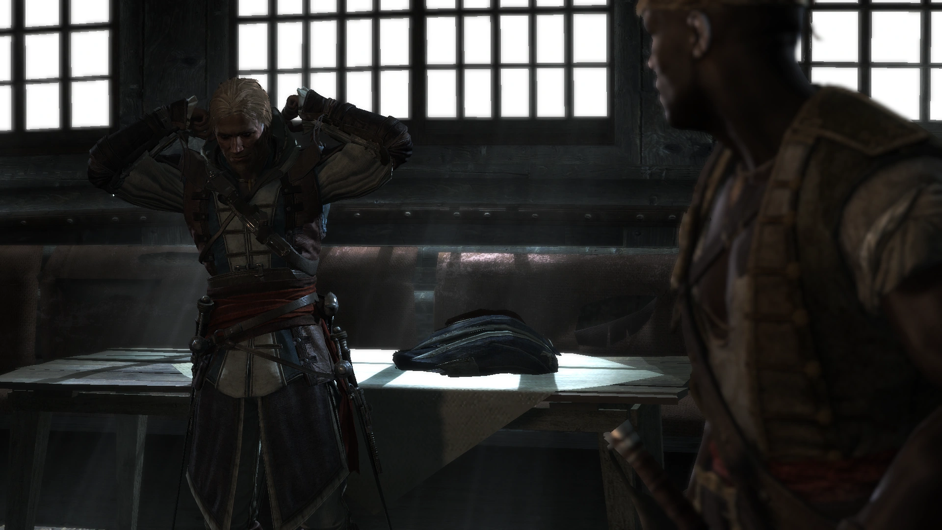 Edward decided to name his newly-acquired ship the Jackdaw and, realizing that hardly any of his new crew would accept Adéwalé as captain, dubbed him quartermaster. After a brief excursion to Abaco Island, where he hunted some animals to craft himself a new holster,[23] Edward sailed to Nassau with his new ship, where he introduced Adéwalé to three of his old associates: Edward Thatch, James Kidd, and Benjamin Hornigold. Edward then moved throughout the British-occupied town, freeing imprisoned pirates to recruit as crewmen and weakening British control over the island.[24]