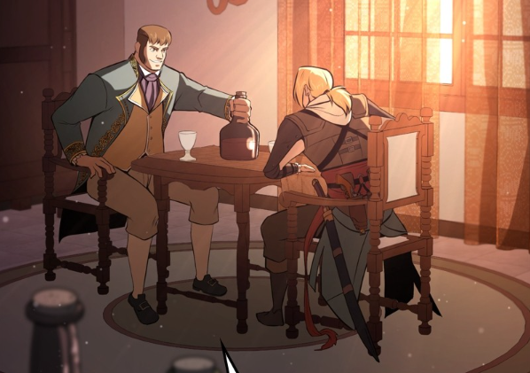 During a night of drinking, in late 1712, Scott approached an inebriated Edward in a tavern and offered him a deal, sending Caroline back to him by leaving her in exchange for a large sum of money. Scott tried to convince him to accept his offer, but Edward fainted before giving an answer and his father-in-law took him to the Kenway farmstead, where he took the opportunity to show his distraught daughter what a bad husband Edward was.[4]