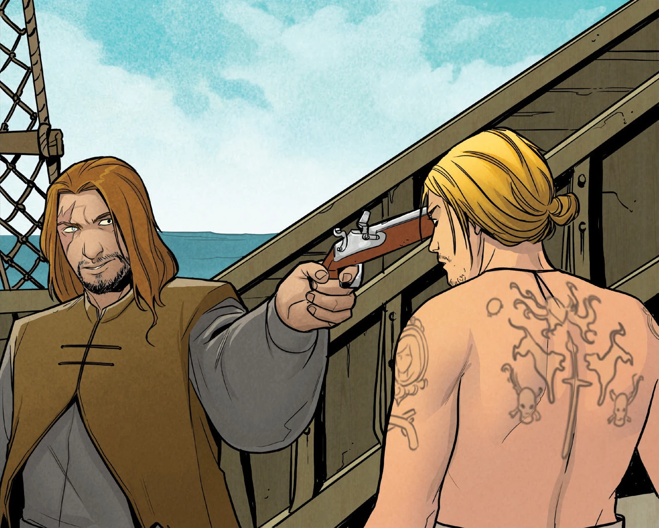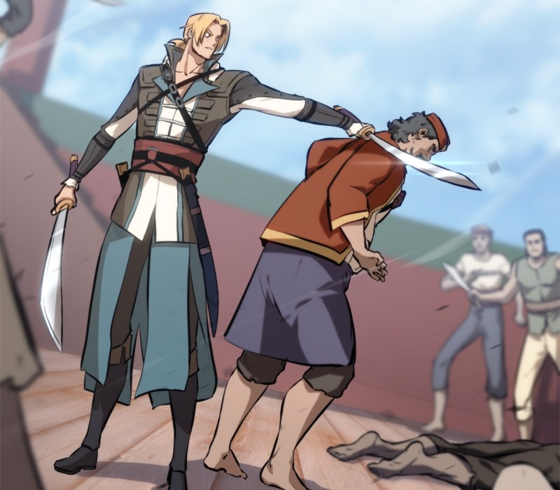 At the same time, the privateer Edward Thatch and his crew came to the rescue of the Amazon Galley, still loyal to the British Crown. Seeing that they were outnumbered, Blaney decided to mutiny against his former crew, killing first mate Trafford before moving in on Edward. However, Thatch took a liking to Edward and instead proposed a brawl to decide who should join his crew, pitting Edward against Blaney.[4]