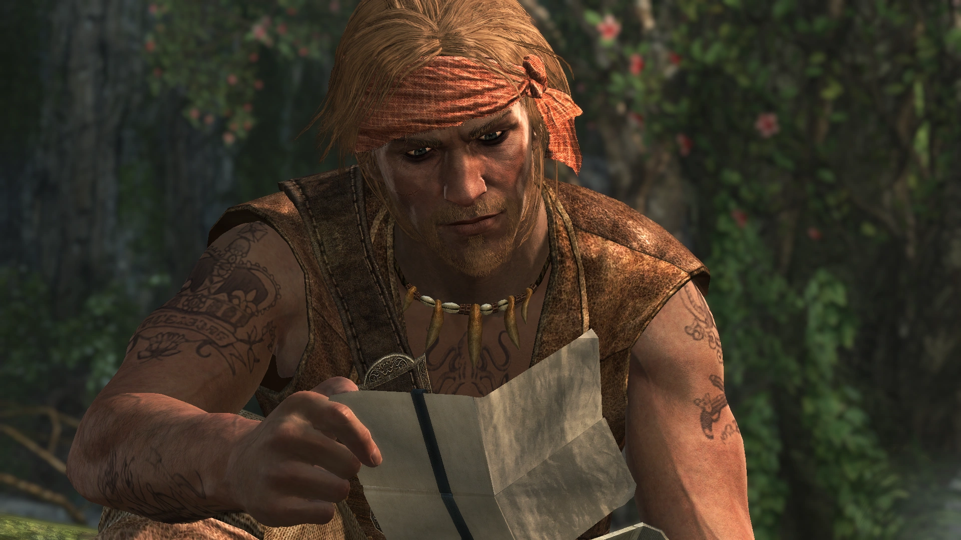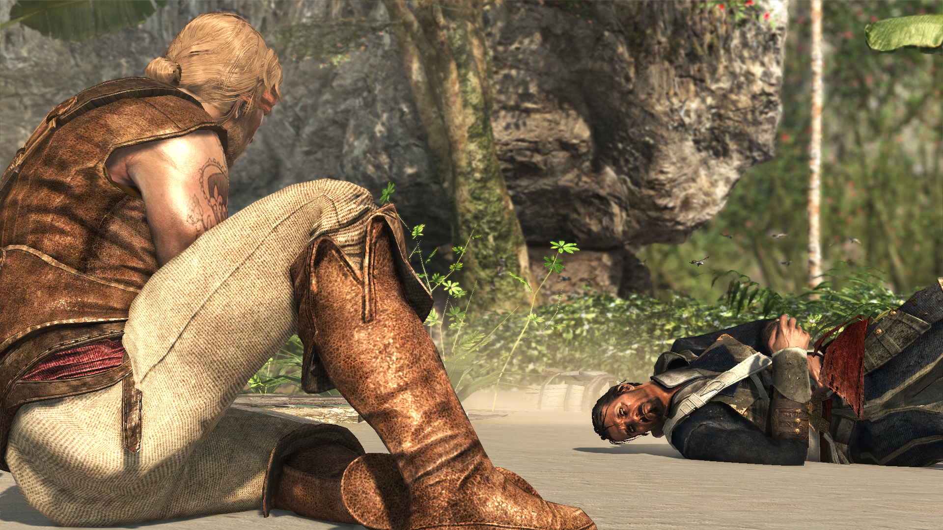 Edward woke up in the water in the present and swam towards a beach, where the injured Assassin followed him