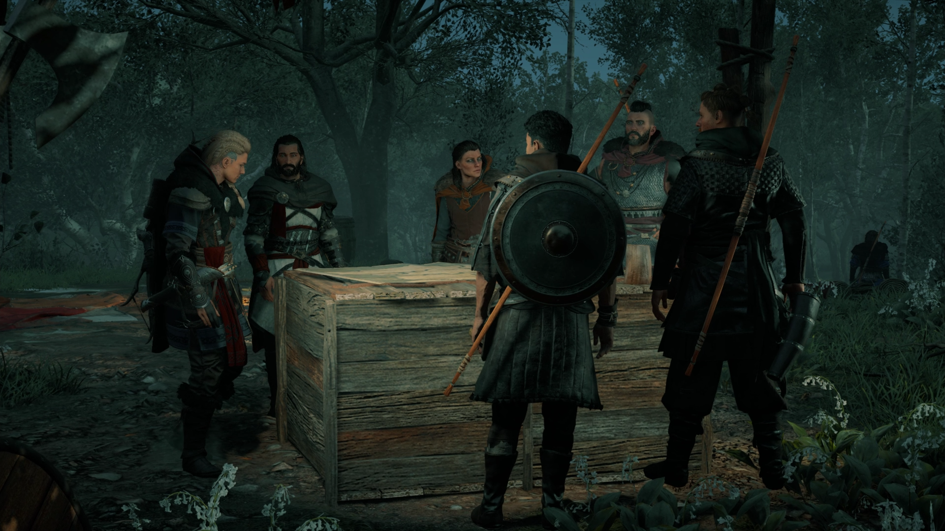 Eivor left the captive to the Raven Clan members and went to the rendezvous point in Grantebridgescire. She inspected a nearby longship with the Raven Clan flag, and concluded that the raiders had attempted to raid as members of the clan and pin the blame on the Raven Clan. Nearby, Eivor found and collected a clan outfit still in fine condition. She examined surrounding corpses, which had been impaled by a Hidden Blade. Eivor remarked on the familiarity of the wounds. Behind her, three Saxon mercenaries approached, blaming her for the slaughter. After realizing she was a real Viking, the Saxons prepared to battle her. Just as they drew their weapons, a smoke bomb was thrown at their feet by an unknown individual, blinding them and causing them to cough. The individual attacked the Saxons and brought their lives to an end via a Hidden Blade.[260]