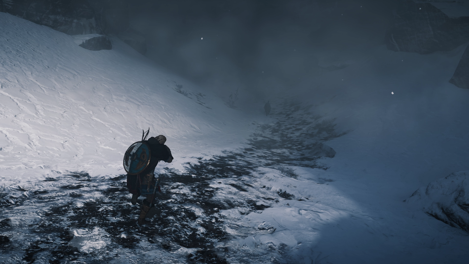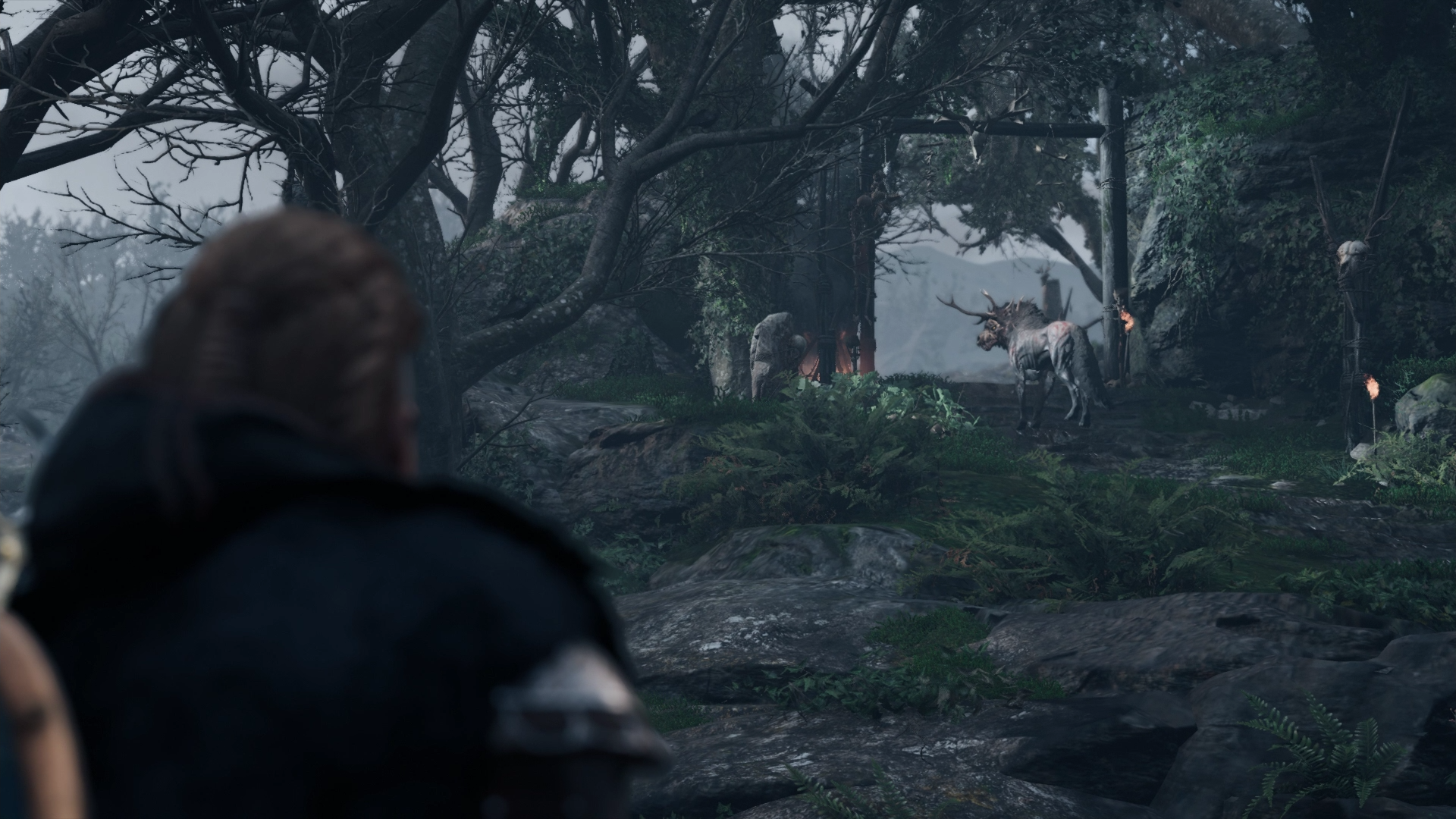 Within the dream induced by the elixir, Eivor saw Sigurd, standing next to the same wolf and cloaked man she had envisioned previously. Calling out to him, Eivor followed the silhouette as he moved further up the mountain, hearing the voices of Skuld and Urðr, two of the Nornir, along the way. Further up the path, Eivor spotted the wolf and caught sight of the Nornir weaving fate, eventually reaching a doorway guarded by the animal. Eivor entered the door and was soon confronted by a blizzard. Walking through it, Eivor heard her brother's scream, eventually reaching the edge of a cliff where she discovered that Sigurd had lost his right arm. Eivor reached out to Sigurd only for him to be yanked backward by an invisible force. She was then confronted by a gigantic Fenrir who emerged from the fog, hungry and ready to strike.[20]